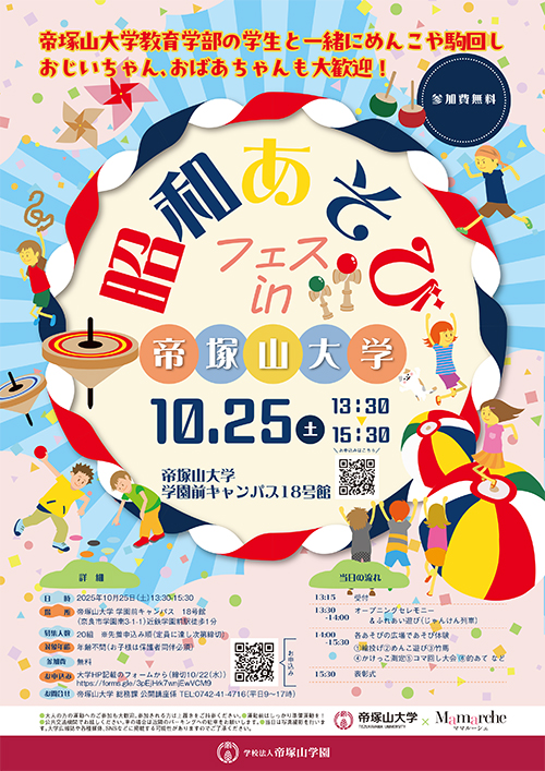 教育学部こども教育学科は、地域情報誌「ママルーシェ」と共催で、10月25日(土)13:30より、学園前キャンパスにて「昭和あそびフェス in 帝塚山大学」を開催します。