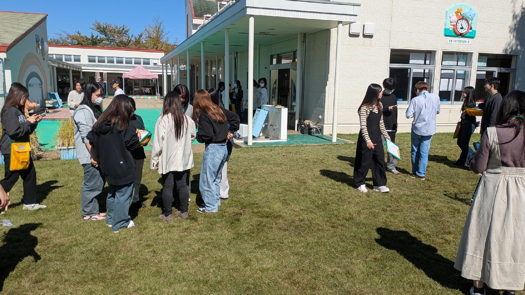 学生たちは帝塚山幼稚園の園庭におじゃまして、秋を探します。