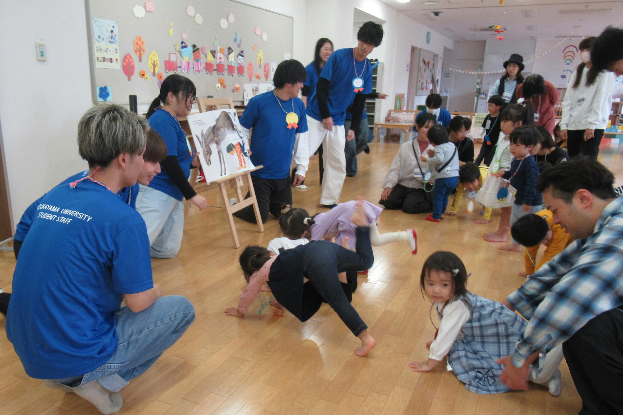 「えほんであそぼう」では、絵本のストーリーに合わせてみんなで体を動かしました。