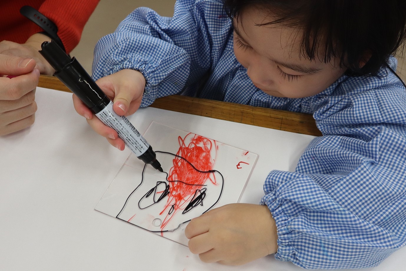まず、透明なアクリル板にマジックペンで好きな絵や模様を描いていきます。