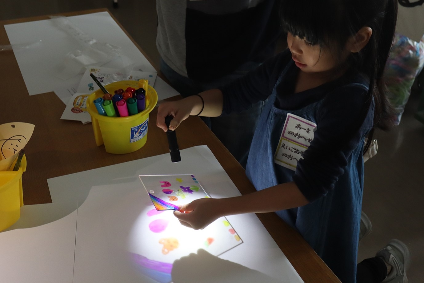 部屋の明かりを消し、パパやママがスマホのライトをアクリル板にあてると、描いた絵や模様が壁に大きく映し出され、幻想的な光の世界が広がりました。
