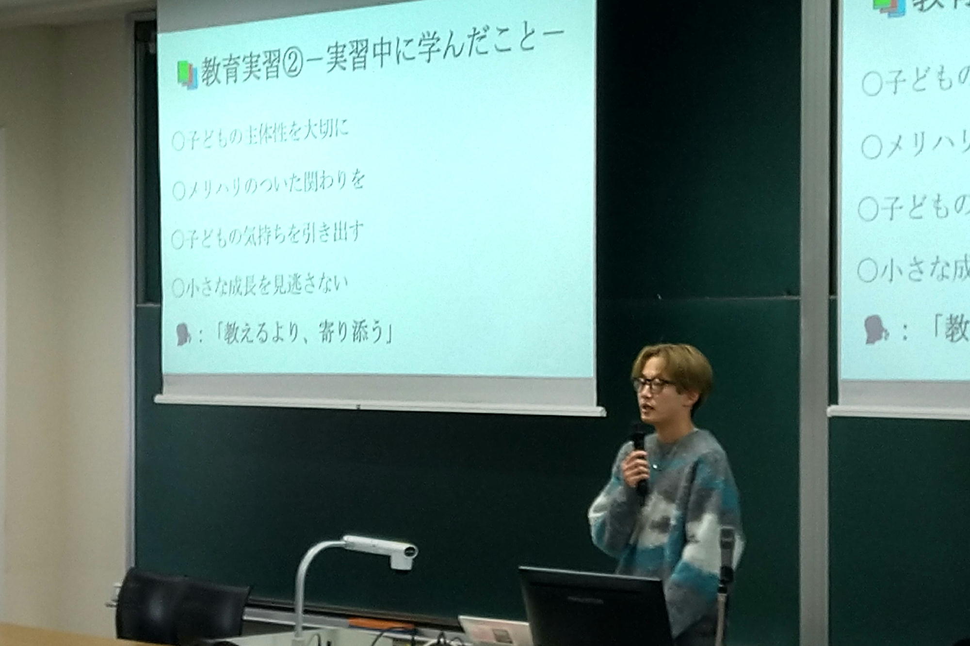 就職活動に向けて早めに意識しておきたいことや、3年次に控える教育実習の準備について、実体験を交えながら分かりやすく語られました。