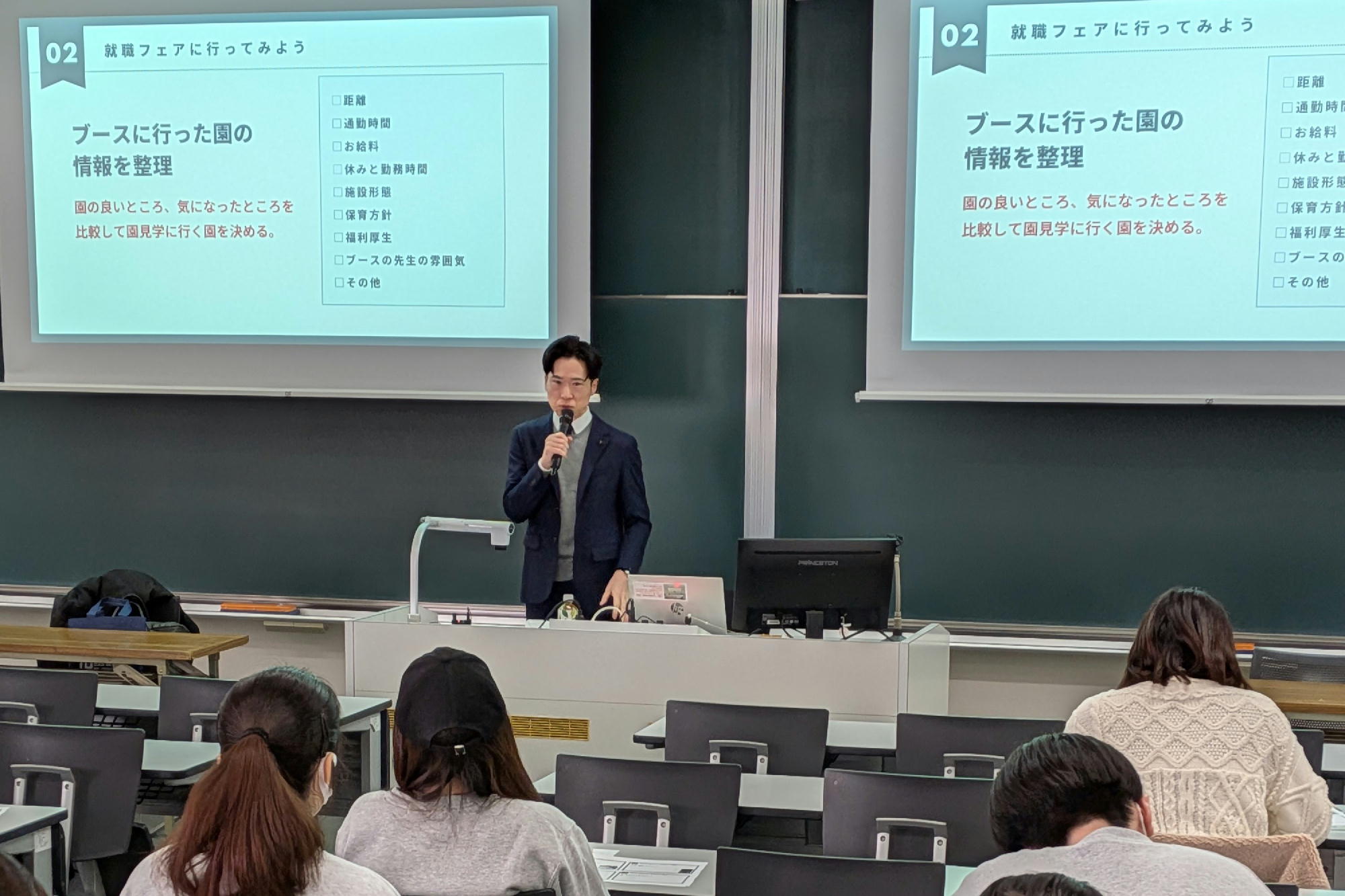 1時間目には、ベルサンテスタッフ株式会社 ほいコレ事業部より斉木将志氏をお招きし、「勝つ! 幼保就活!」をテーマにご講義いただきました。