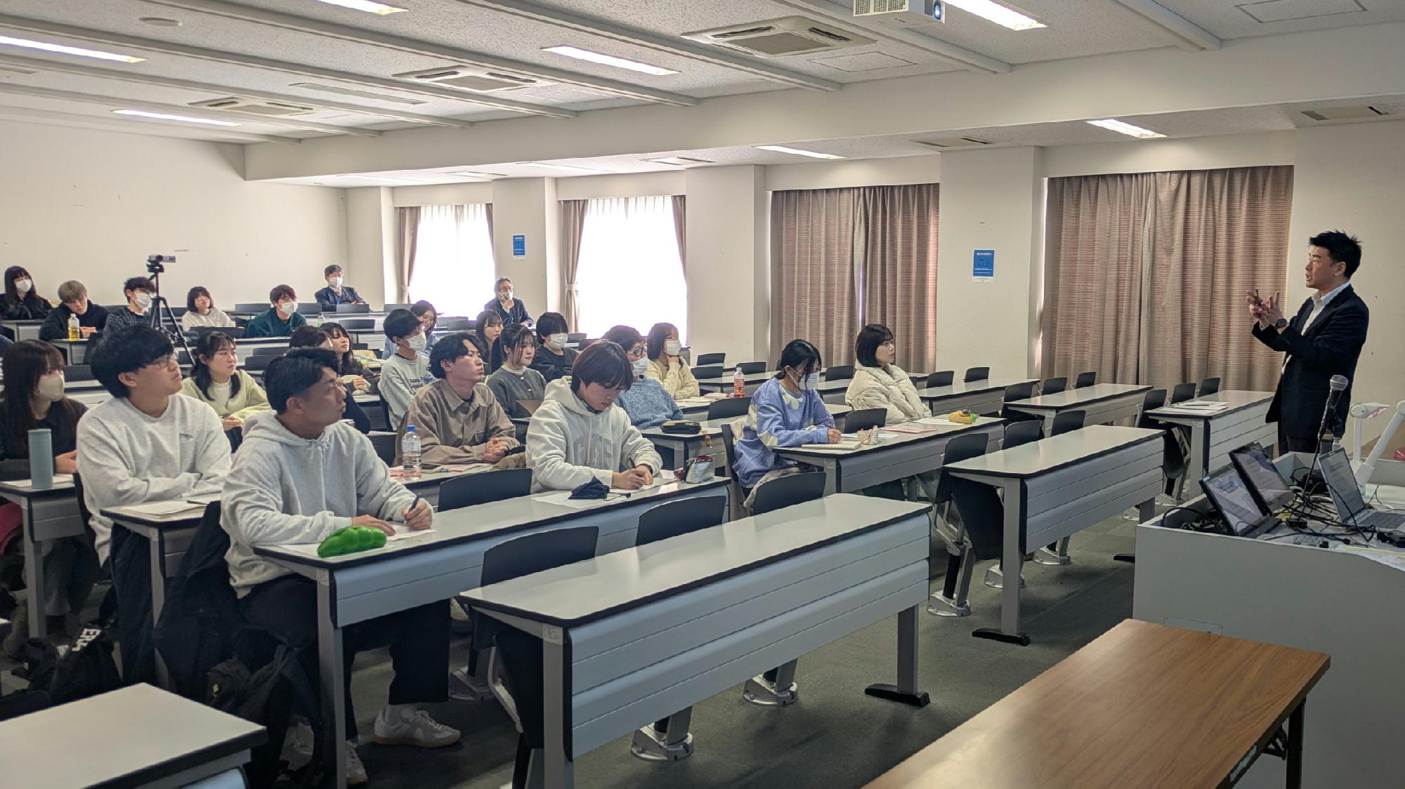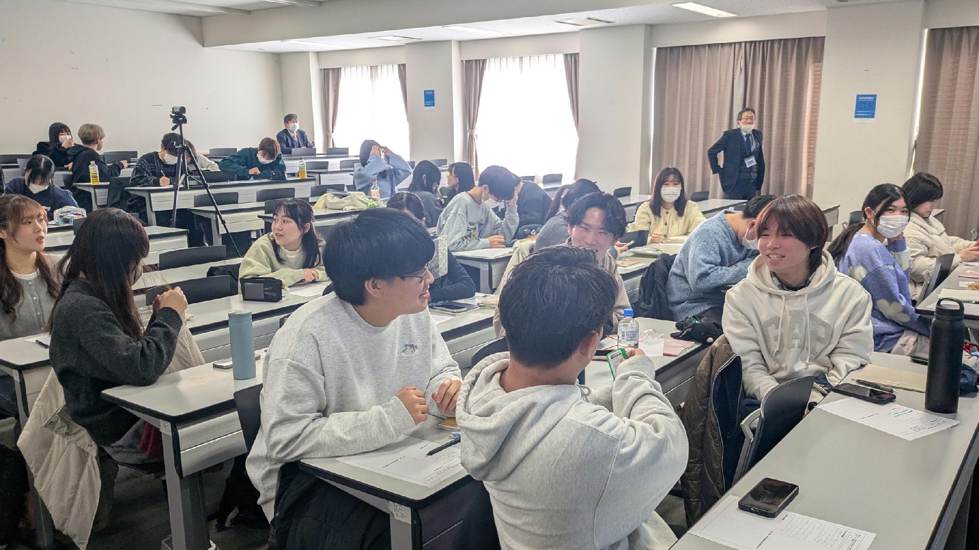 教室内を動きながら学生一人ひとりに語りかけ、時には問いかけ、時には励ましの言葉を添えるなど、熱量のこもった講義に、学生たちも真剣な表情で耳を傾けていました。