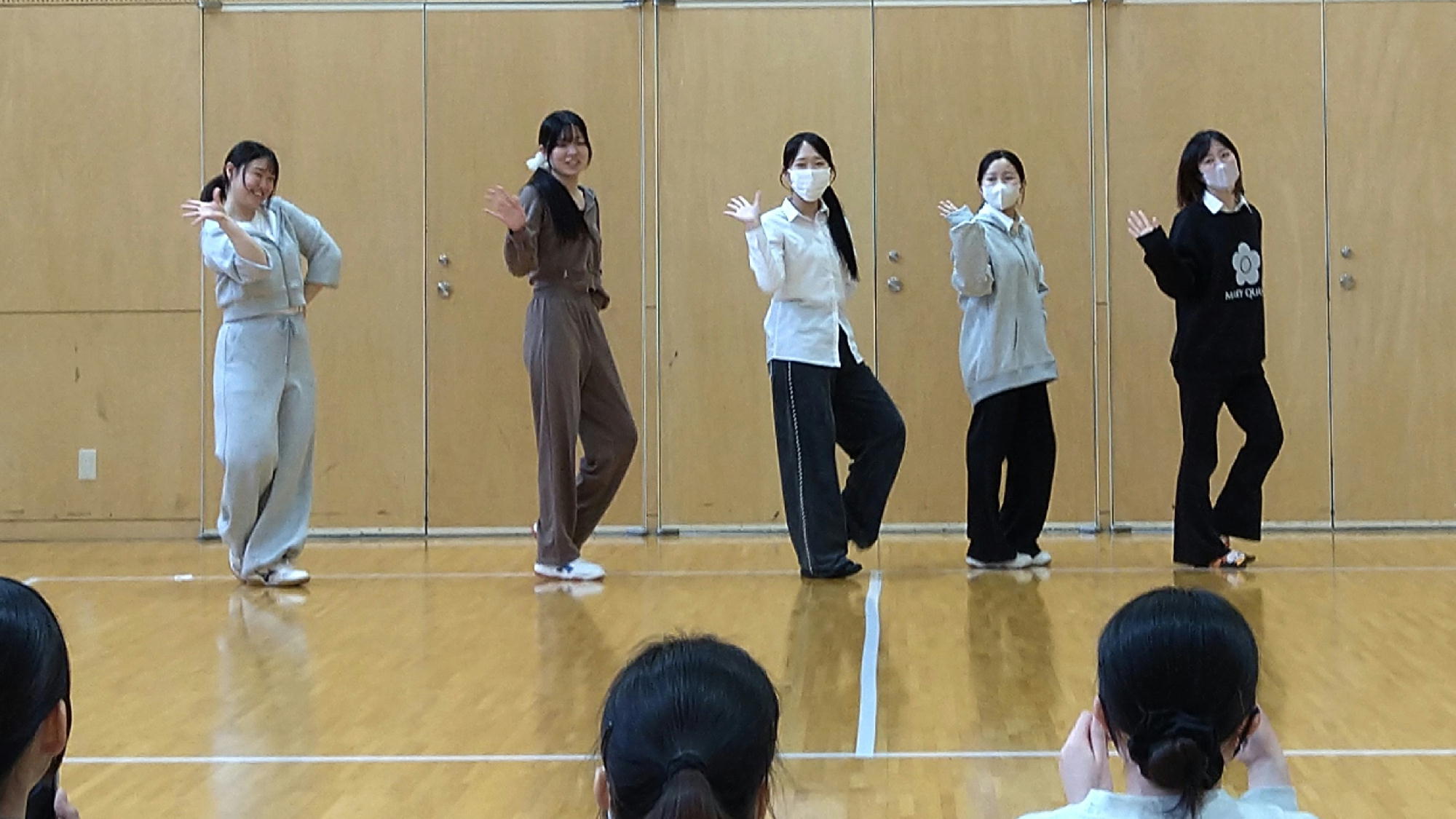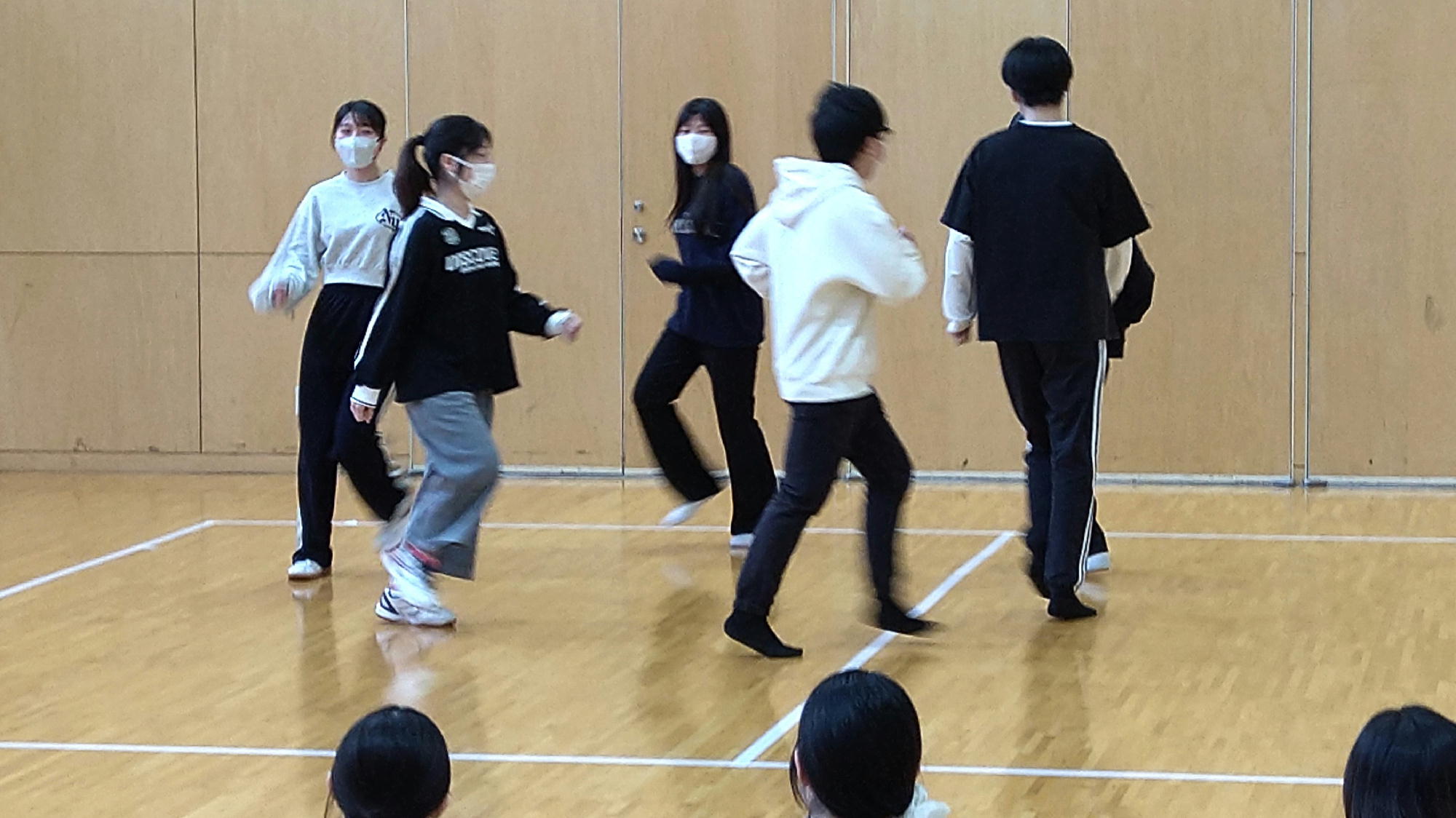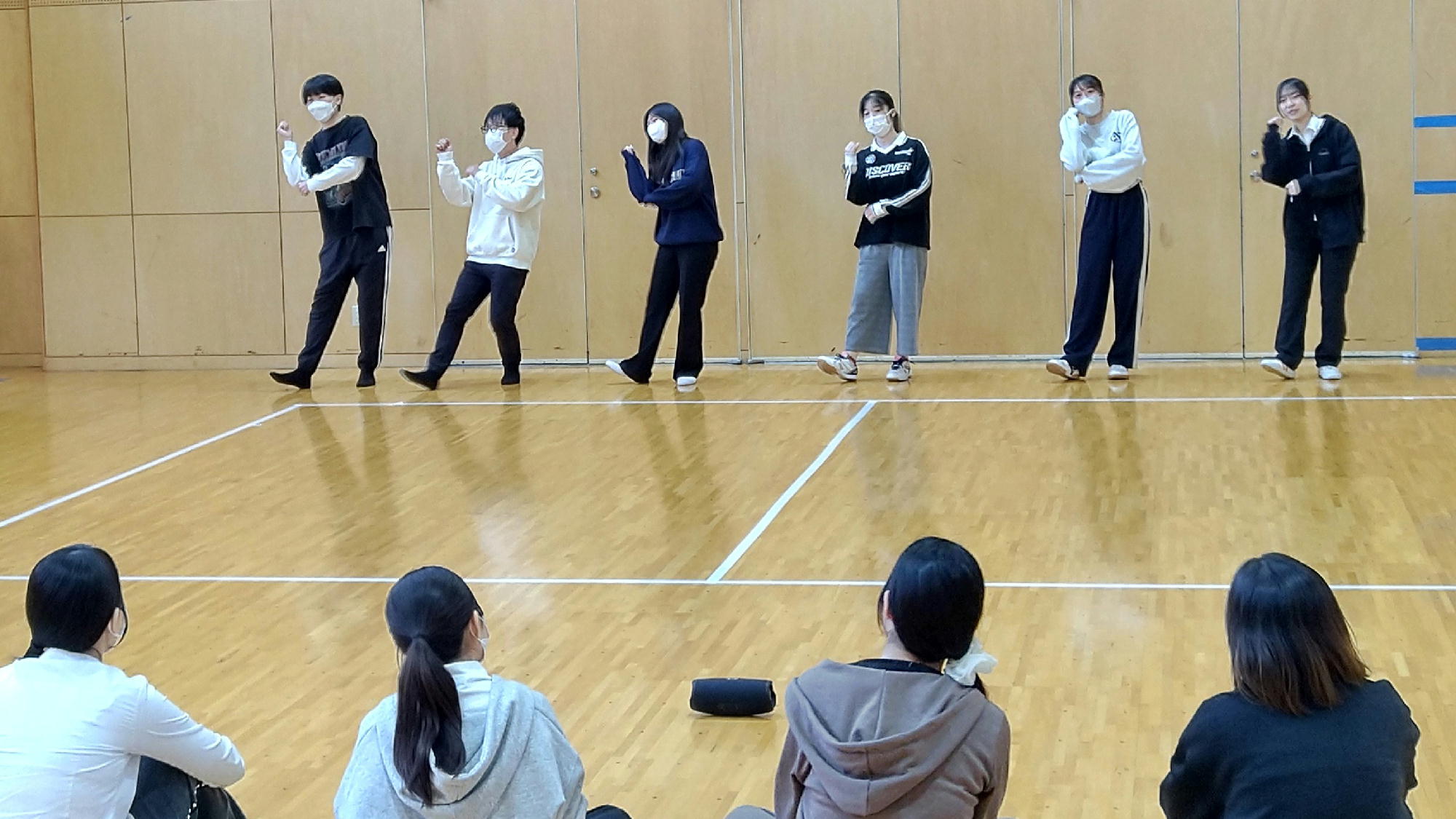 学生たちは歌詞からイメージをふくらませ、動きや関わり方、場面のつながりを工夫しながら、グループごとに表現をつくり上げていきました。