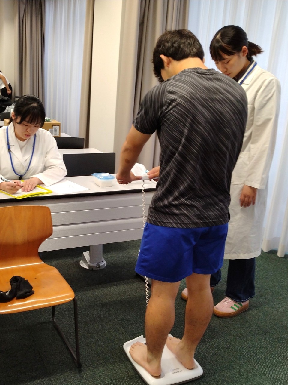 食物栄養学科の渡邊ゼミでは、体育会系クラブの選手への栄養サポートを行っています。後期からは3年生のゼミ活動がスタートし、レスリング部の選手のみなさんの体重と体脂肪率測定を行いました。スポーツ選手のパフォーマンスアップには、筋肉を増やして体脂肪を減らすことが重要です。選手のみなさんには体脂肪率を意識して競技に適した体づくりが行われるように、栄養サポートに取り組みます。