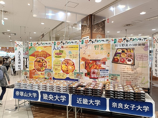 奈良県内の4大学(奈良女子大学、帝塚山大学、近畿大学、畿央大学)の管理栄養士養成課程の学生で構成された食育ボランティアサークル「ヘルスチーム菜良」は、奈良県、及び奈良県と包括連携協定を締結するイオン株式会社のグループ企業、イオンリテール株式会社近畿カンパニー食品部と協働し、「野菜のとれるお弁当」を開発しました。10/15(水)~10/28(火)の期間中、近畿地区のイオン及びイオンスタイル89店舗で販売します。また、10月18日(土)には、イオン大和郡山店(大和郡山市 下三橋町741)で開催中の「大和郡山フェア」内で学生による試食販売イベントを行いました。