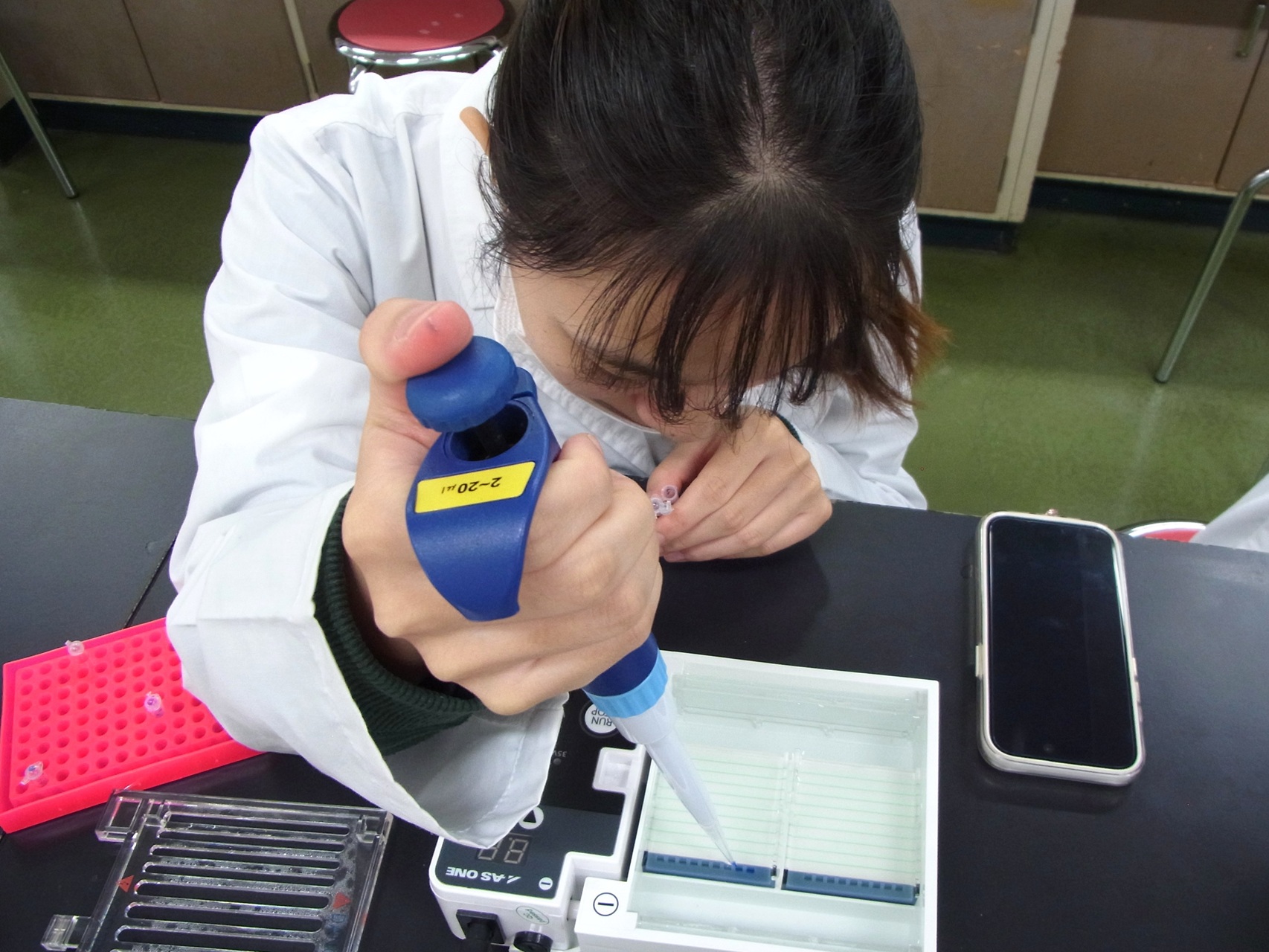 今回は、これまでで最も繊細なピペット操作が要求される実験でしたが、事前練習の甲斐あって、ほとんどの班で電気泳動によりPCR産物を確認することができ、どれが汚染検体なのかを容易に特定できたようです。