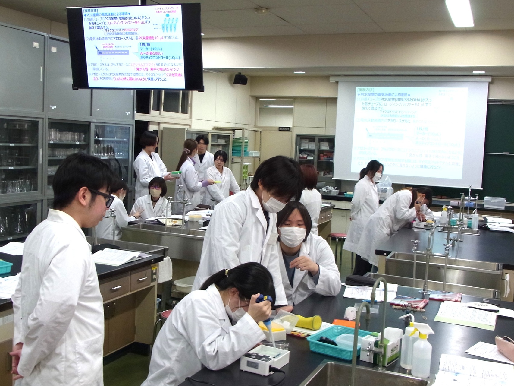 2年生後期の生化学実験では、前期の生化学で学んだことを実験で再確認しています。今回の実験テーマは『PCR』で、各班に4つの食肉検体を配布し、どの検体が大腸菌で汚染されているのかをPCR法を用いて判定してもらいました。