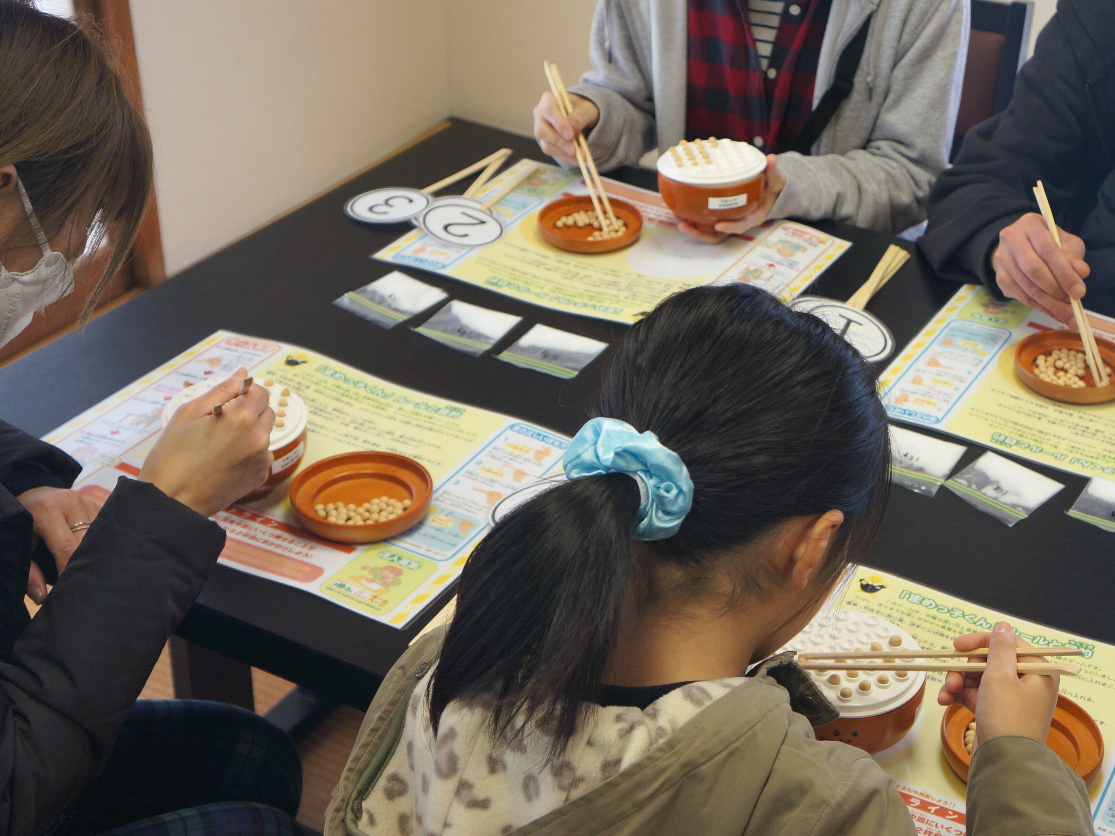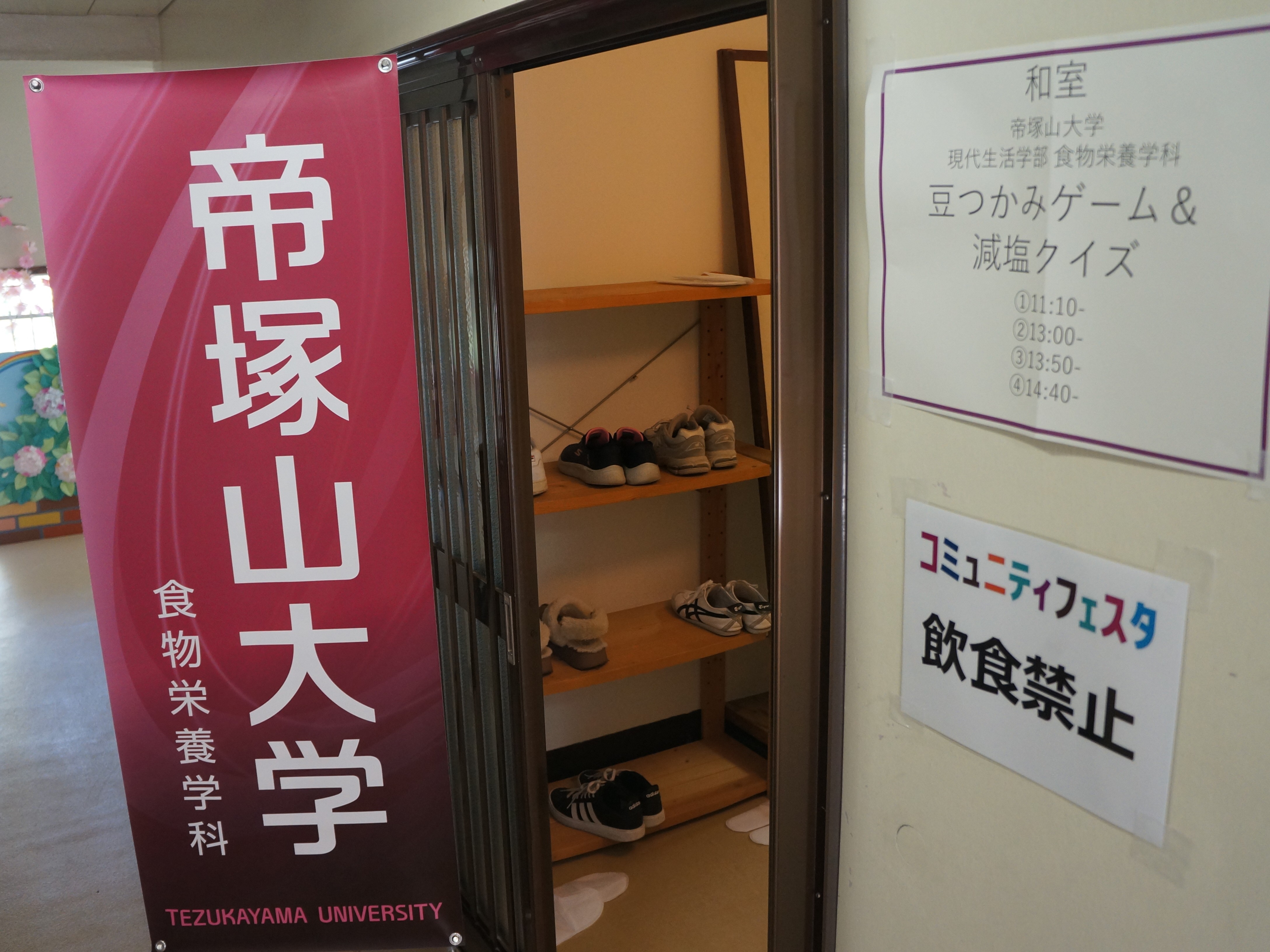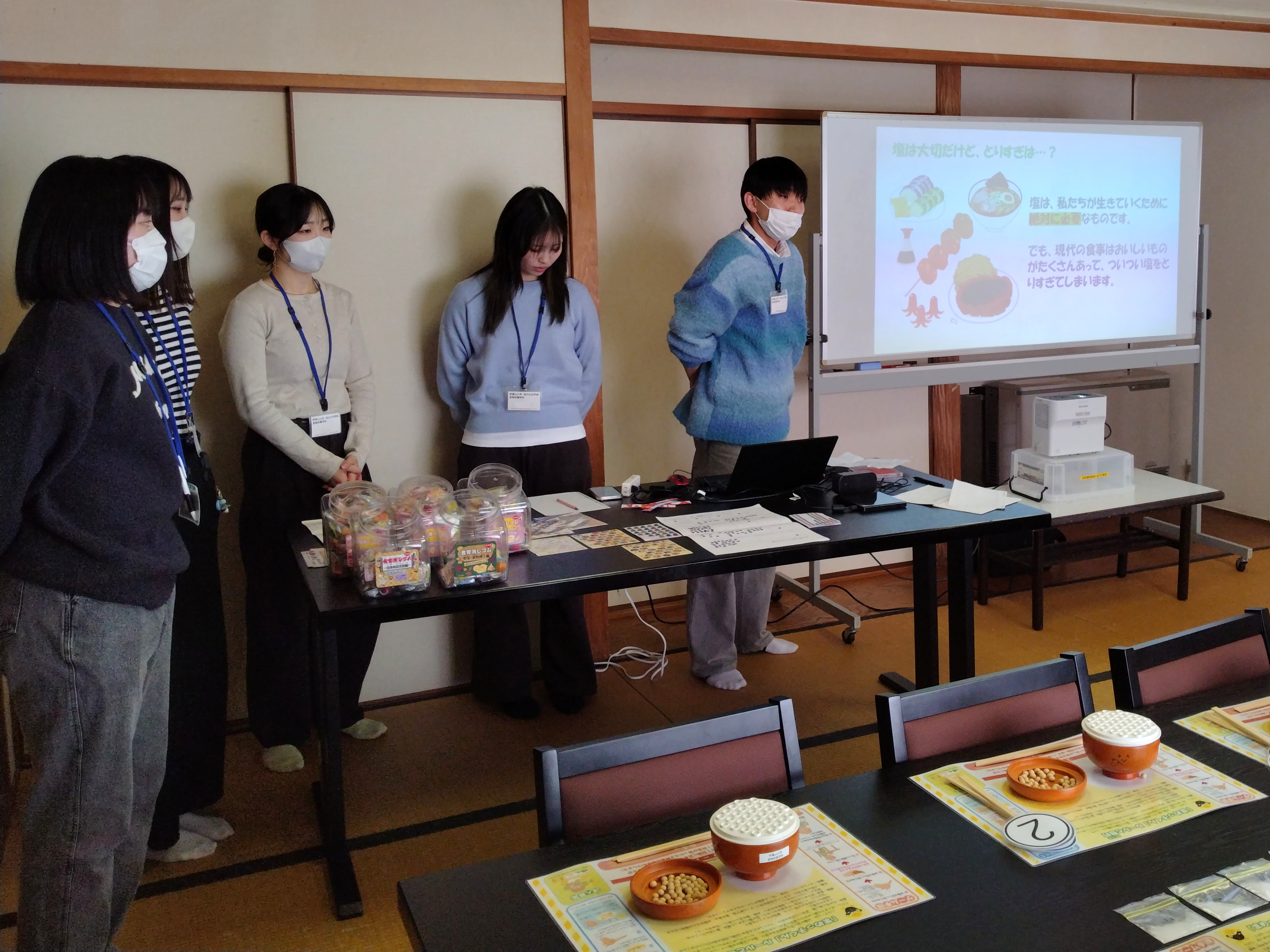 中登美第3団地でUR都市機構と帝塚山大学が共同開催した「コミュニティフェスタ」にて、渡邊ゼミの3年生が「豆つかみゲーム&減塩クイズ」を企画・運営しました。減塩についての説明、クイズの問題と解説、および、参加賞でお渡しする調味料に含まれる食塩量のカードの作成とリハーサルをゼミの時間に行って、本番に臨みました。