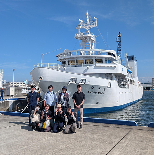 この実習では、神戸大学大学院海事科学研究科のご協力のもと、同研究科所有の附属練習船「海神丸」で神戸大学深江キャンパスと高松港(香川県高松市)の間を往復航行する中で、海上交通における安全の確保や海上航行の構造と理論などを船内での講義・実習を通して学びます。今年度も中京大学心理学部の方々(なんと30名超の大所帯)と乗合で実施されました。