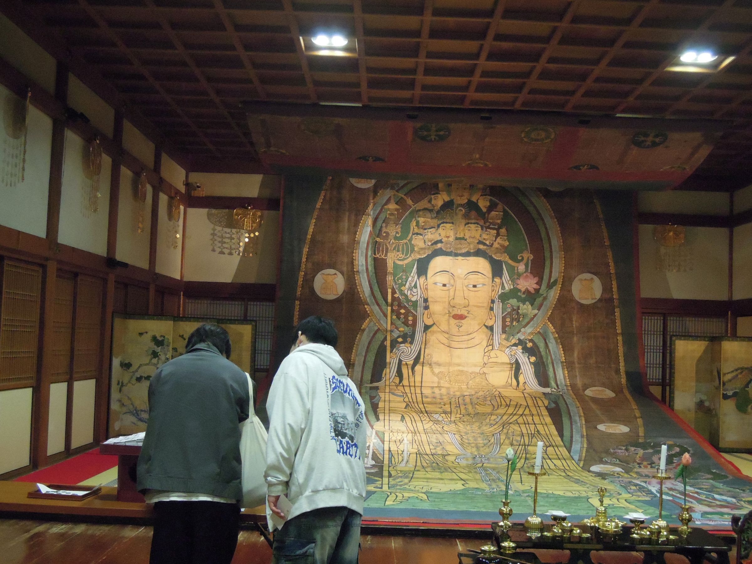 11月2日(日)には長谷寺を拝観しました。7名が参加し、長谷寺の歴史や文学から窺える信仰について解説を聞いてから、登廓を上って宗宝蔵で寺宝を見学しました。さらに本堂に至り、特別拝観で10mを超える大きな観音像に直接触れてお参りしました。大講堂では大画軸や長谷寺縁起絵巻のレプリカも見学することができました。