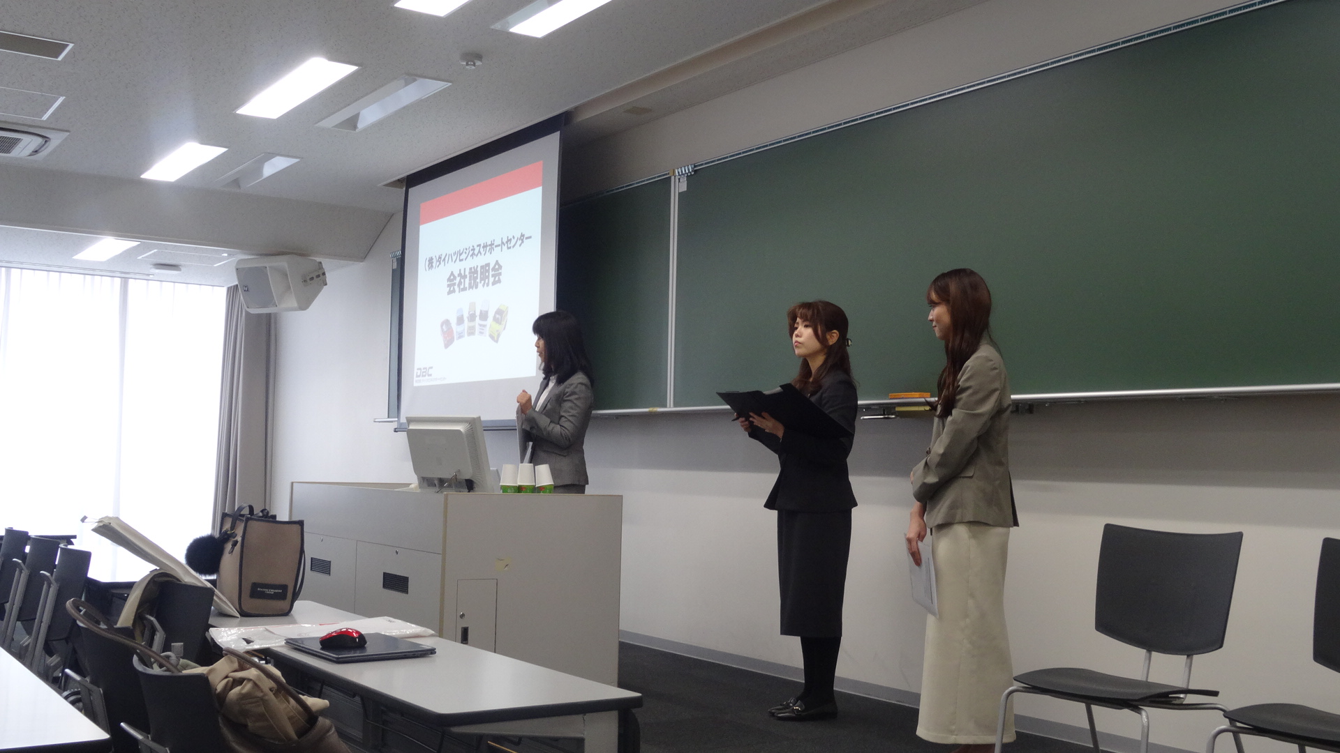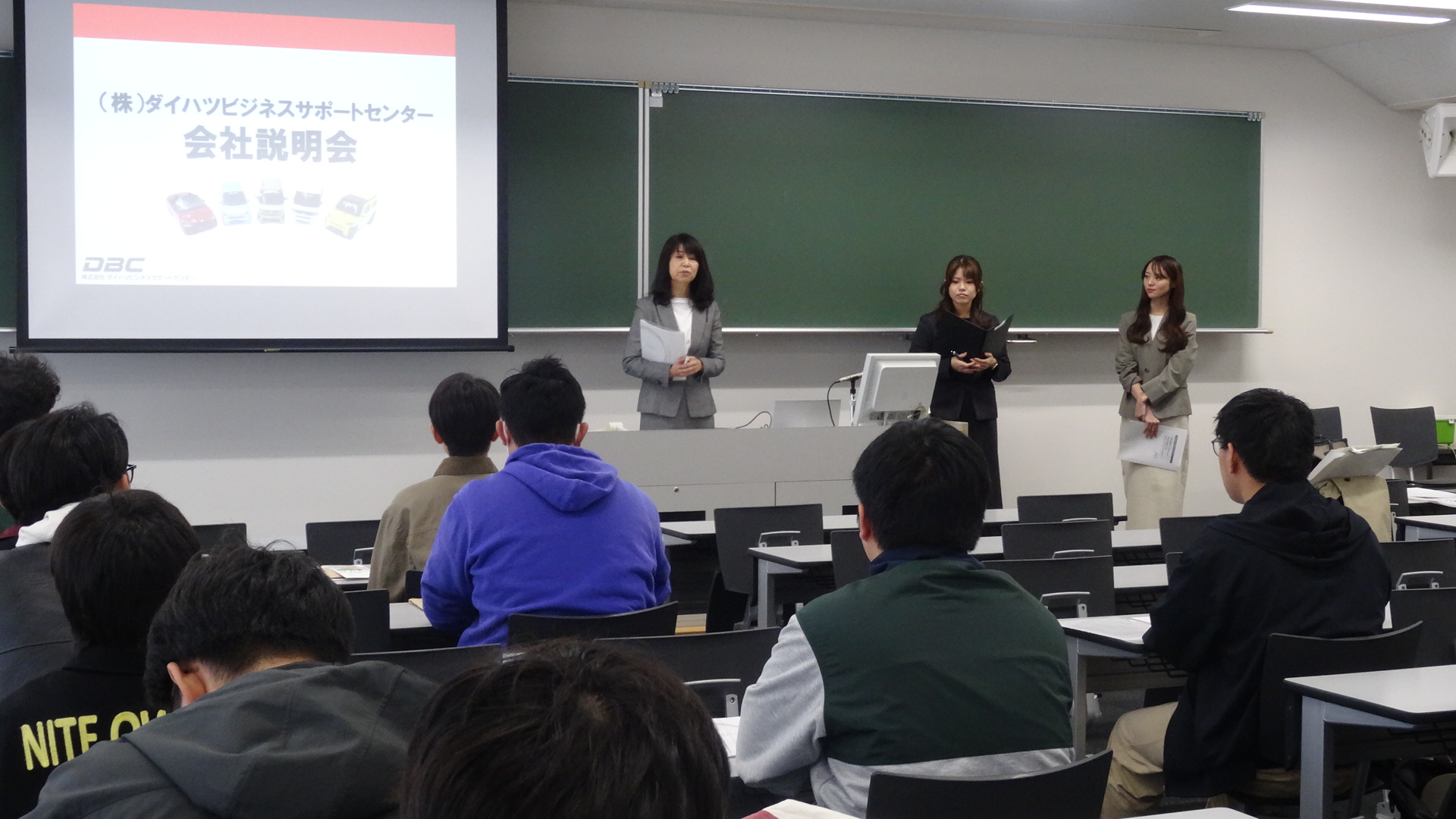 11/4(火)の授業(企業講演初回)では、株式会社ダイハツビジネスサポートセンターの向井美智子さん、荒木晴菜さん、岡部瞳さんにお越しいただき、同社の経営理念・事業内容・研修制度・ジョブローテーション・採用活動等について貴重なお話を伺いました。