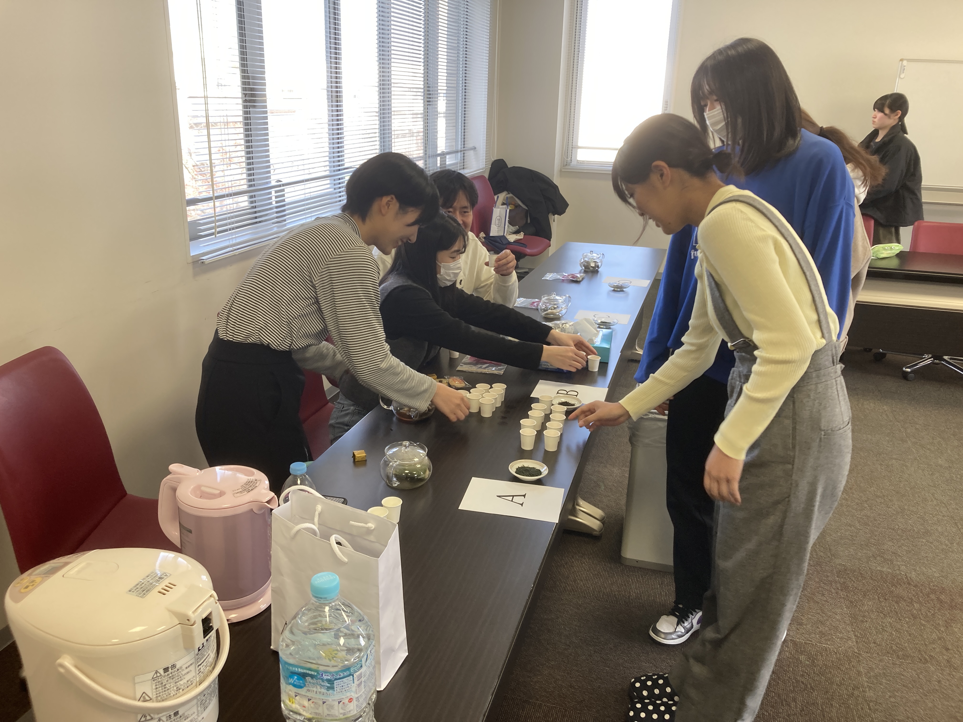 「闘茶」とは、「茶歌舞伎」「茶香服」とも呼ばれ、鎌倉時代に中国の宋から伝わった伝統的な利き茶ゲームのことを指しています。 今回は、本学経済経営学部の学生(ご実家が宇治田原のお茶問屋さん)に協力してもらい、4つのタイプの異なるお茶(煎茶、玉露、ほうじ茶、和紅茶)を飲み比べ、どれがどれかを当てる体験に挑戦しました。河口ゼミの中国人留学生2名もサポーターとして参加してくれました。