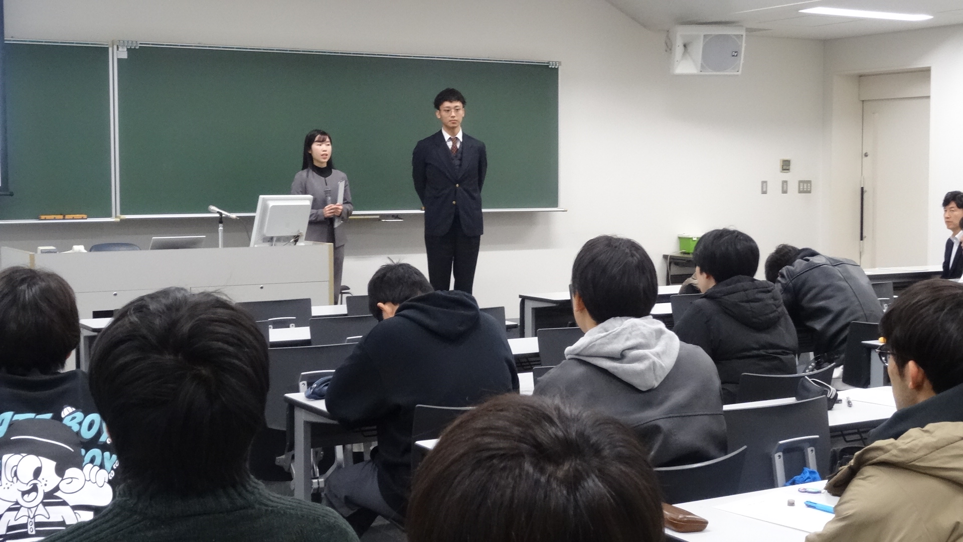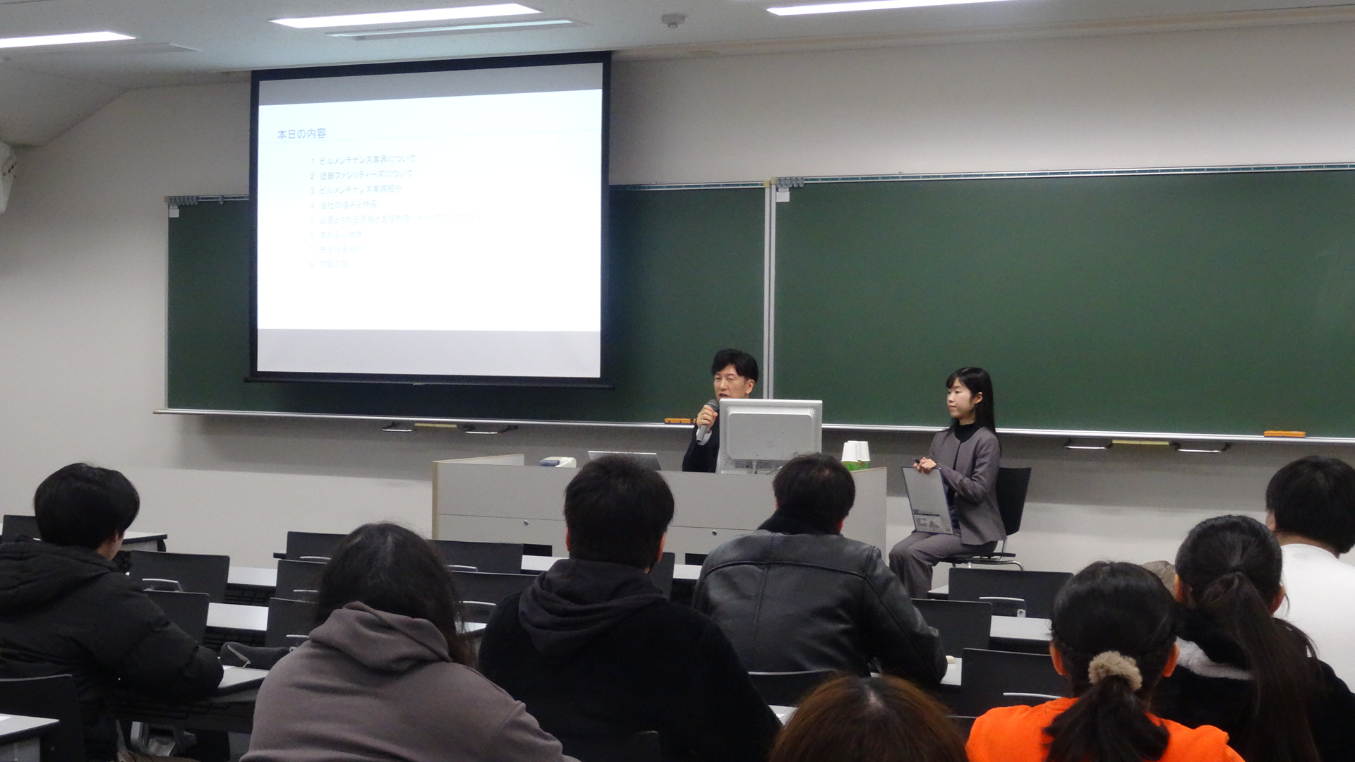 12/9(火)の授業(企業講演最終回)では、近鉄ファシリティーズ株式会社の森部勝巳さん、江頭彩香さん、原田夏さん(文学部卒業生)をお招きし、ビルメンテナンス業界の特性、同社の事業内容・採用活動・研修制度等について貴重なお話を伺いました。