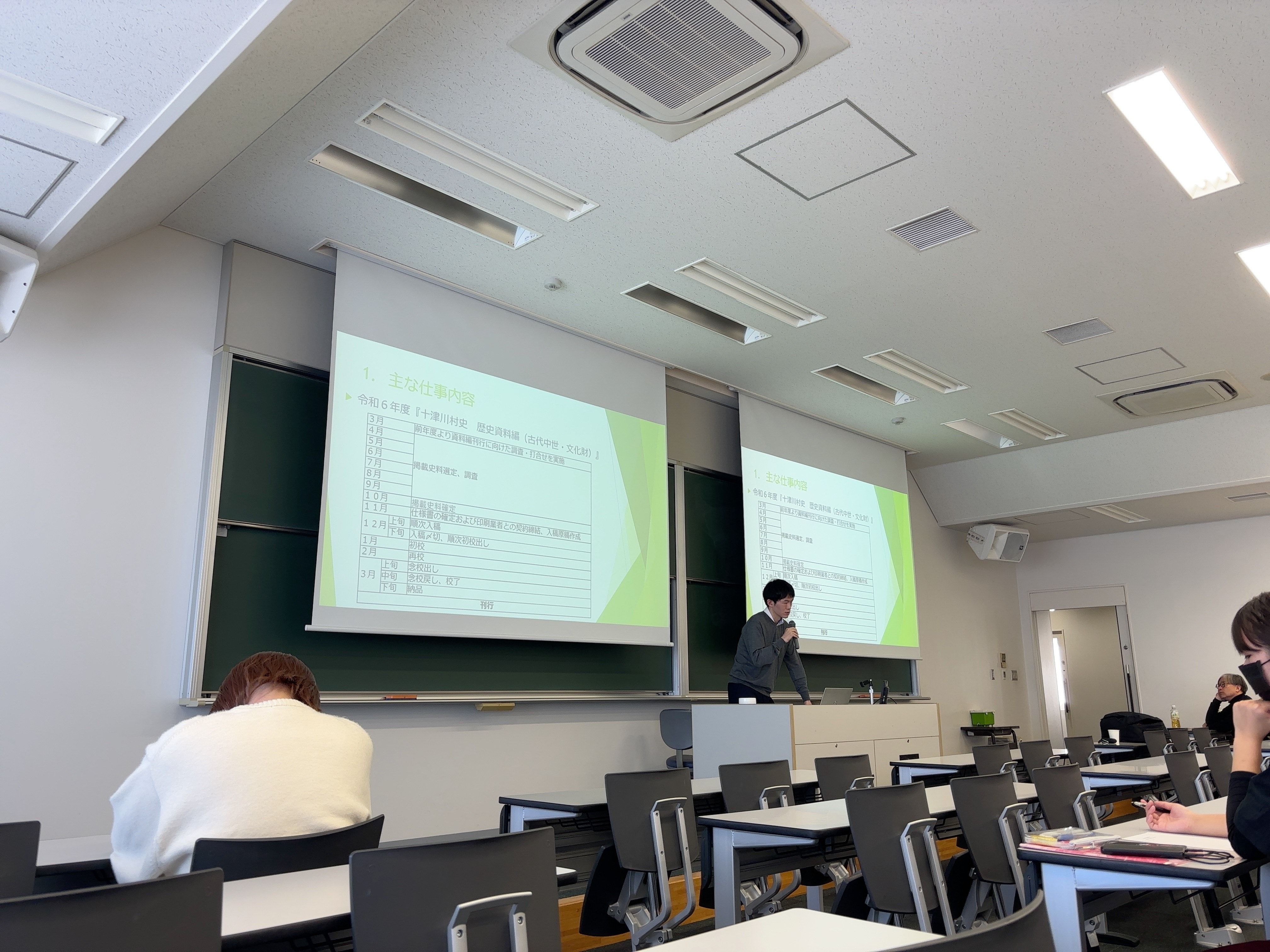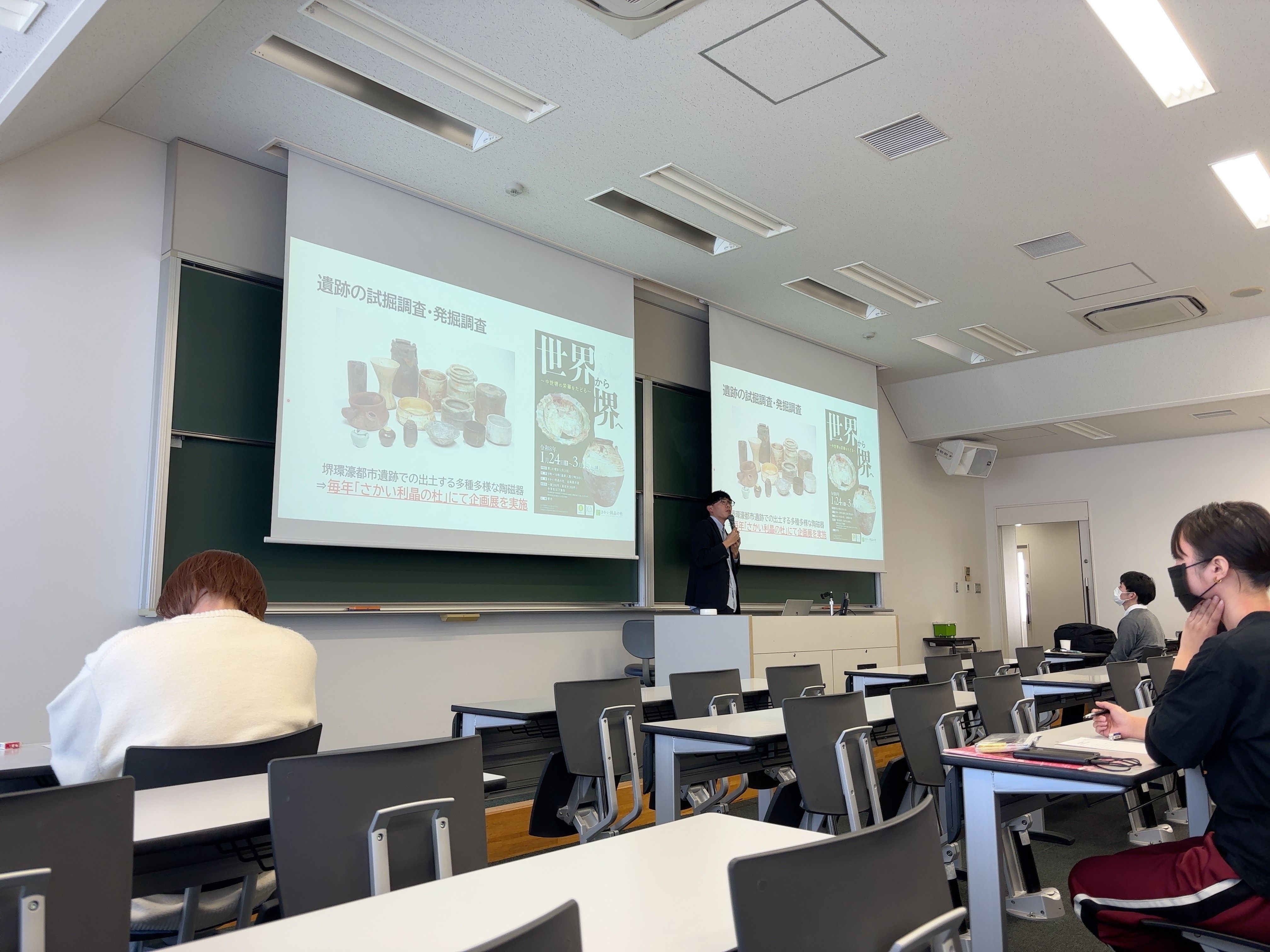12/19(金)2限、文学部の卒業生で、地方自治体の学芸員として活躍されている大向翔太さん(十津川村教育委員会勤務、中世史ゼミ出身)、冨島健司さん(堺市文化観光局勤務、考古学ゼミ出身)、橋本七海さん(富山市民俗民芸村管理センター勤務、民俗学ゼミ出身)をお招きし、「学芸員の仕事内容とその魅力」と題した講演会を行ないました。