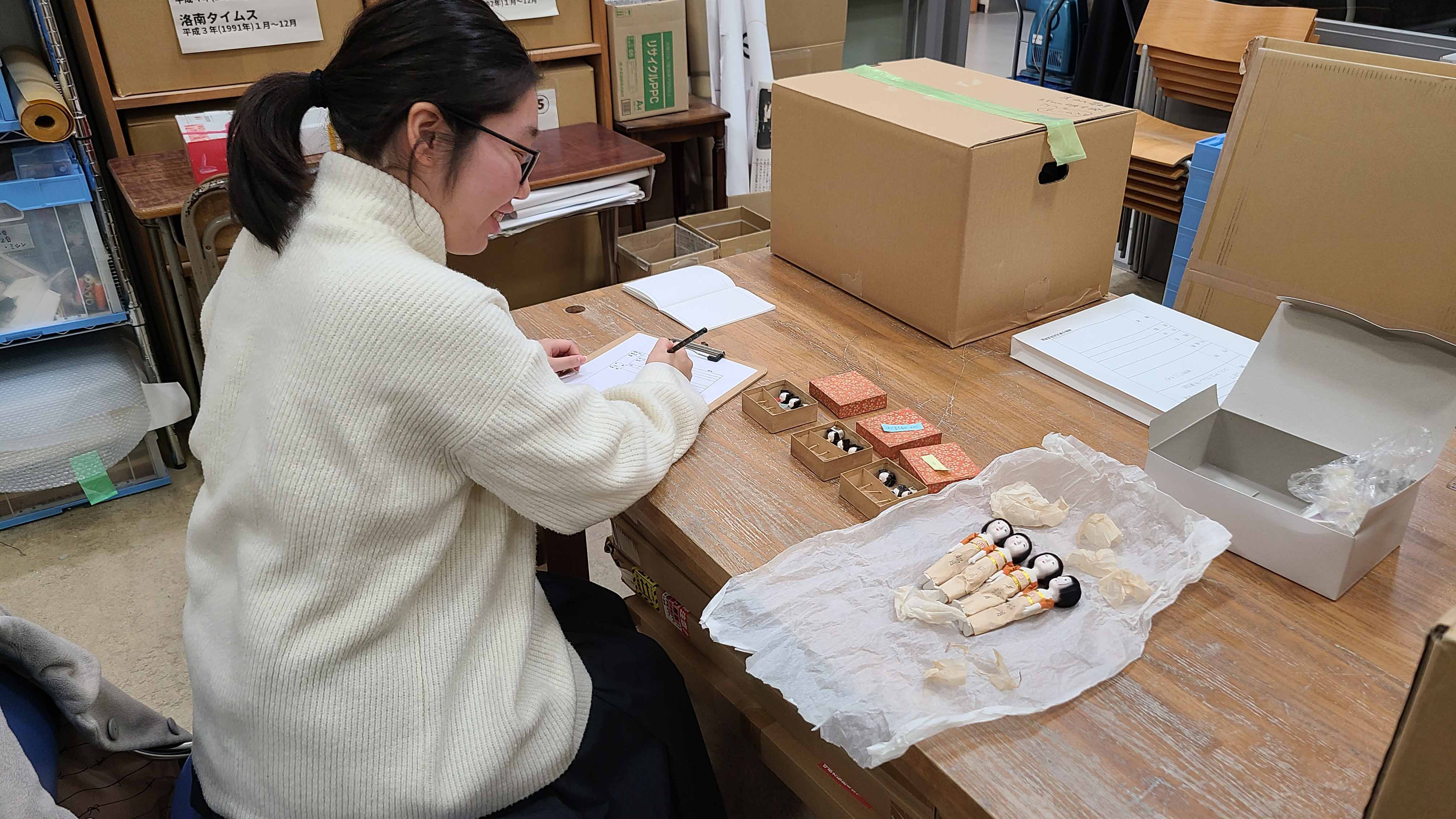 博物館では、展示を構成するにあたり、所蔵資料だけでは説明が難しい部分を他館からお借りした資料で補う場合があります。今回の企画展でも、昭和初期のおもちゃ資料を城陽市歴史民俗資料館からお借りし展示することになり、学生と借用に伺いました。借用に関する手続きを終えた後に、資料の調書を取ります。資料の図を描き、もともとの破損部位など資料の状態を書き込んでいきます。一見すると地味な作業ですが、万が一の事態に備えるもので借用の上では非常に重要な仕事です。学生は「博物館実習Ⅱ」で学んだ調書の取り方を思い出しながら真剣に調書を取っていました。その後資料を梱包し、本学でお預かりしました。お借りした資料は1月19日(月)からの企画展でご覧いただけます。
