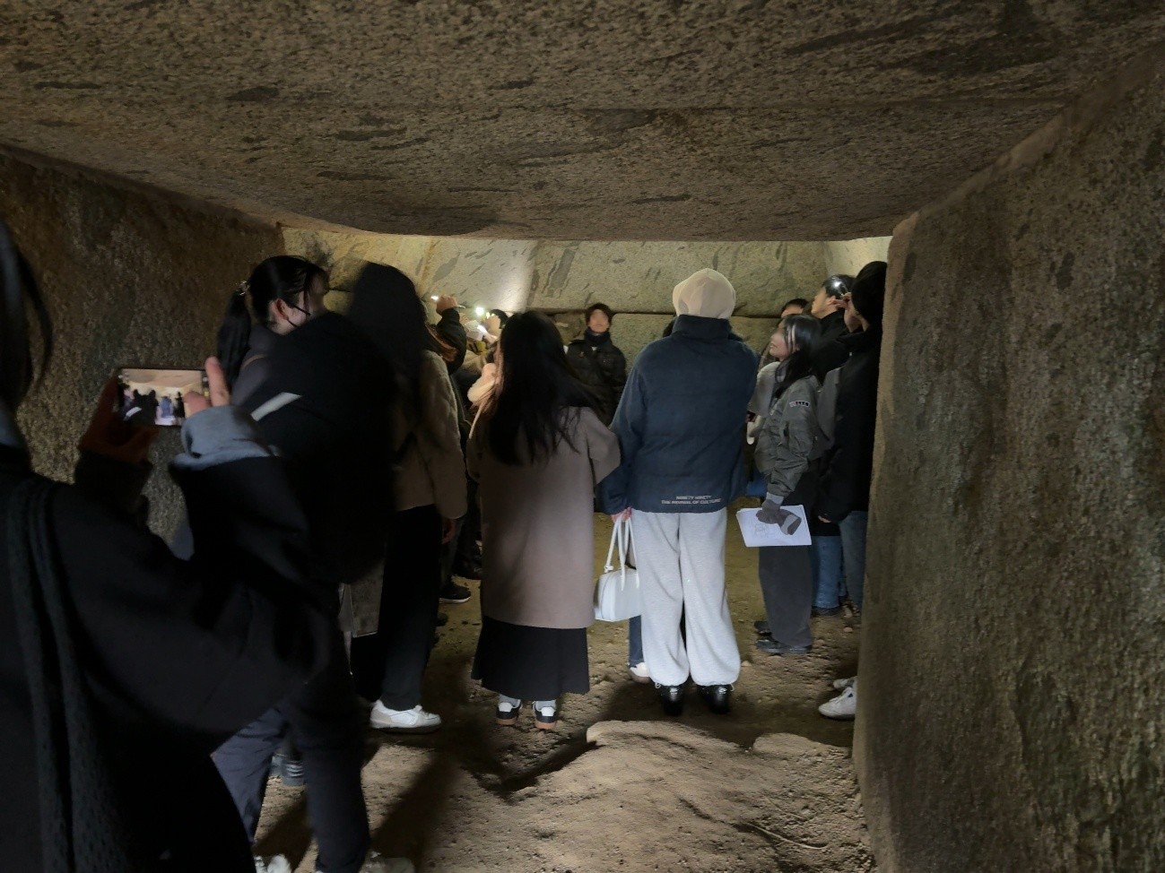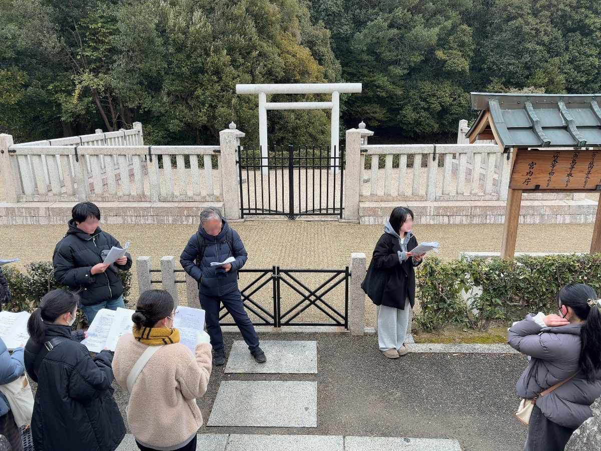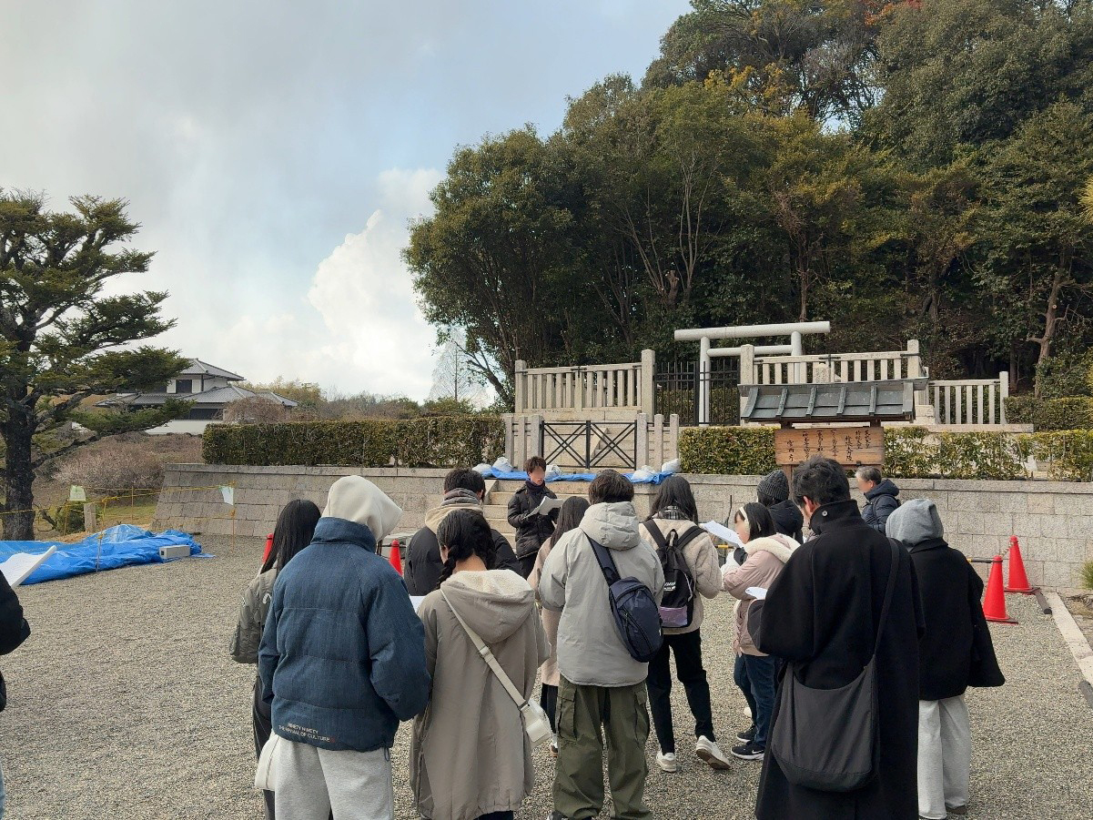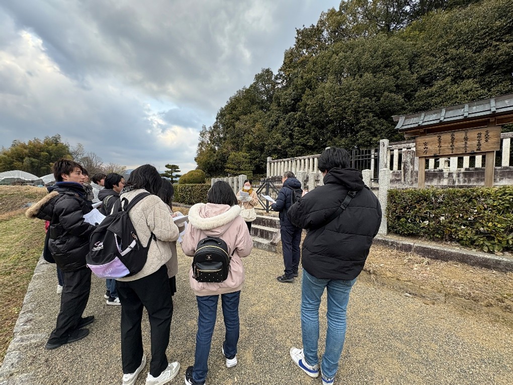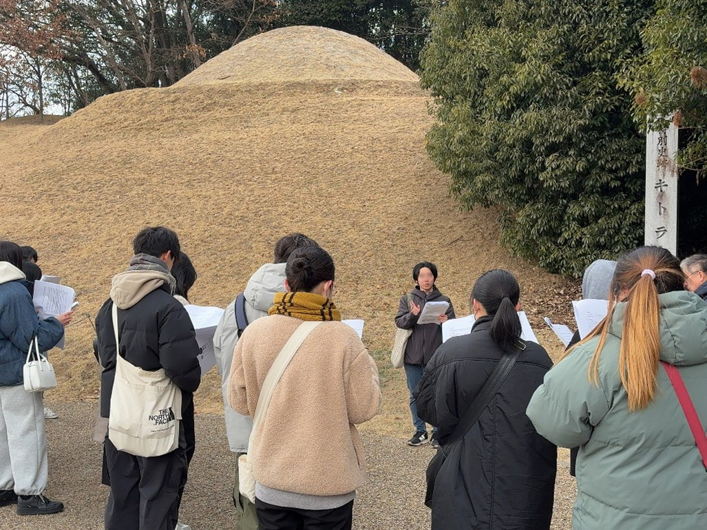 1月24日(土)、考古学ゼミ(担当:清水昭博教授)の3年生が学外授業として、文学部日本文化学科の1年生を対象に飛鳥の古墳を解説しました。ゼミ生たちはキトラ古墳や高松塚古墳、鬼の俎板・雪隠古墳、岩屋山古墳などを巡り、自作した資料を用いてわかりやすいガイドをしてくれました。