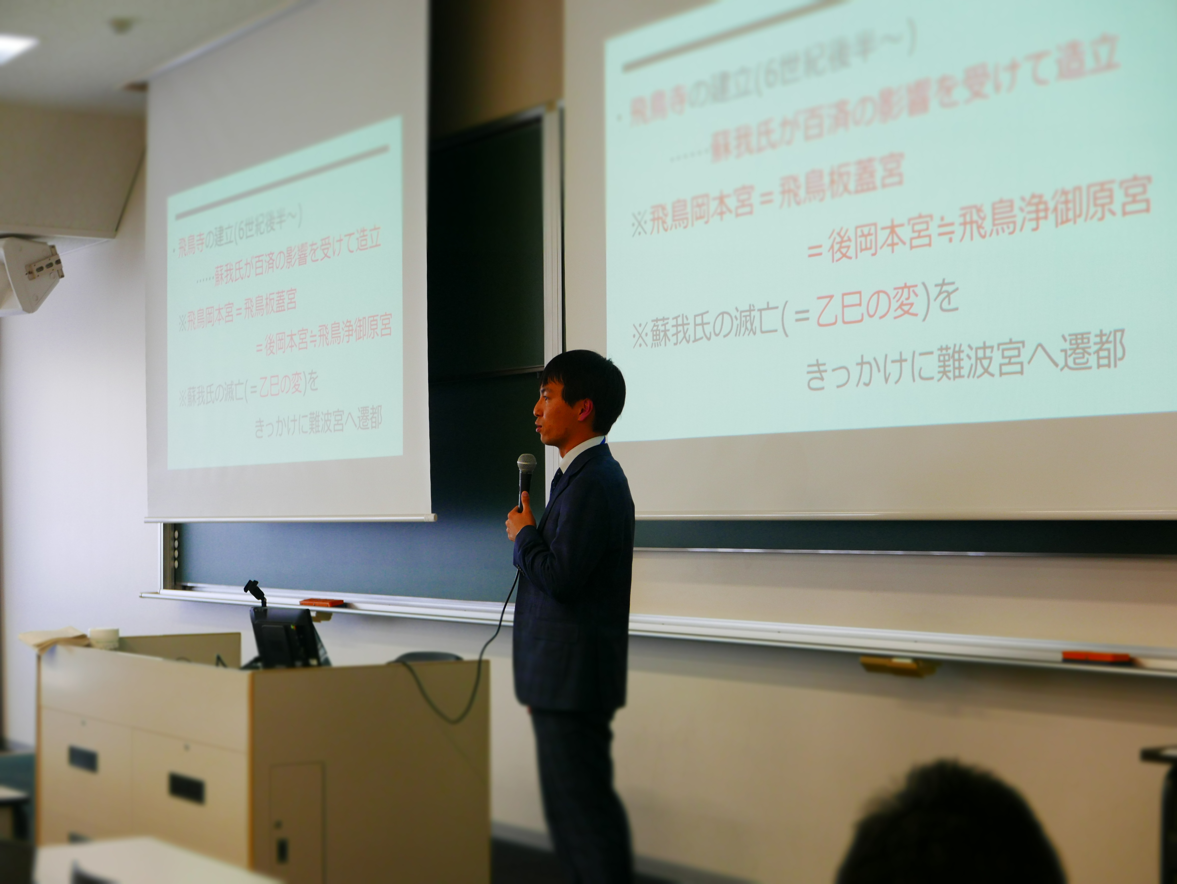 第2回(4/16)は、今年度本学に着任された山上憲太郎准教授(古代史)が担当しました。まずは、歴史学(文献史学)の方法についてかいつまんで説明したうえで、『日本書紀』などの史料に依拠しながら、飛鳥時代における古代国家の形成過程を辿りました。