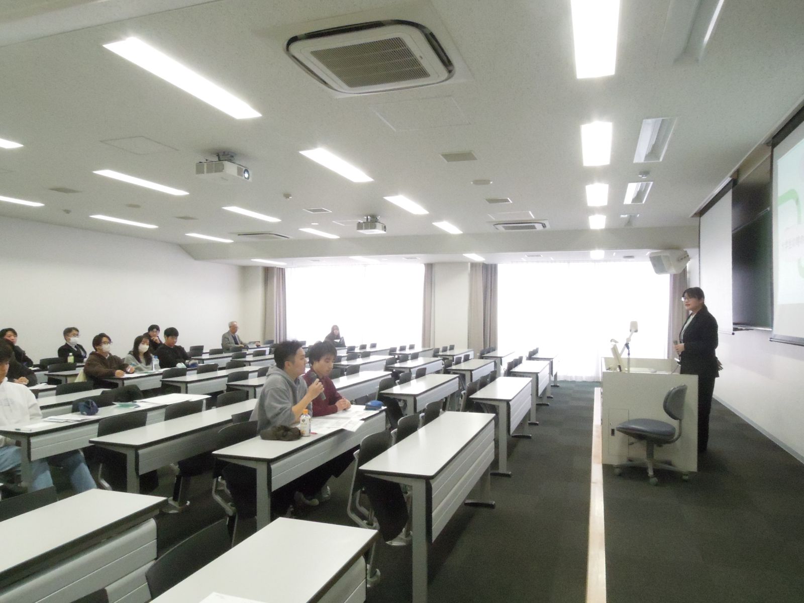 次に、常勤講師として私立高校に勤務する昨年度の卒業生が、仕事の内容や教師の魅力について、具体的に説明してくれました。どのような授業をしているのか、実際にやってみせてくれる場面もありました。4年生も卒業生も、教員を目指す後輩たちの参考になるようにと細やかに配慮しながら、自身の経験で得た重要なポイントを丁寧に伝えてくれました。