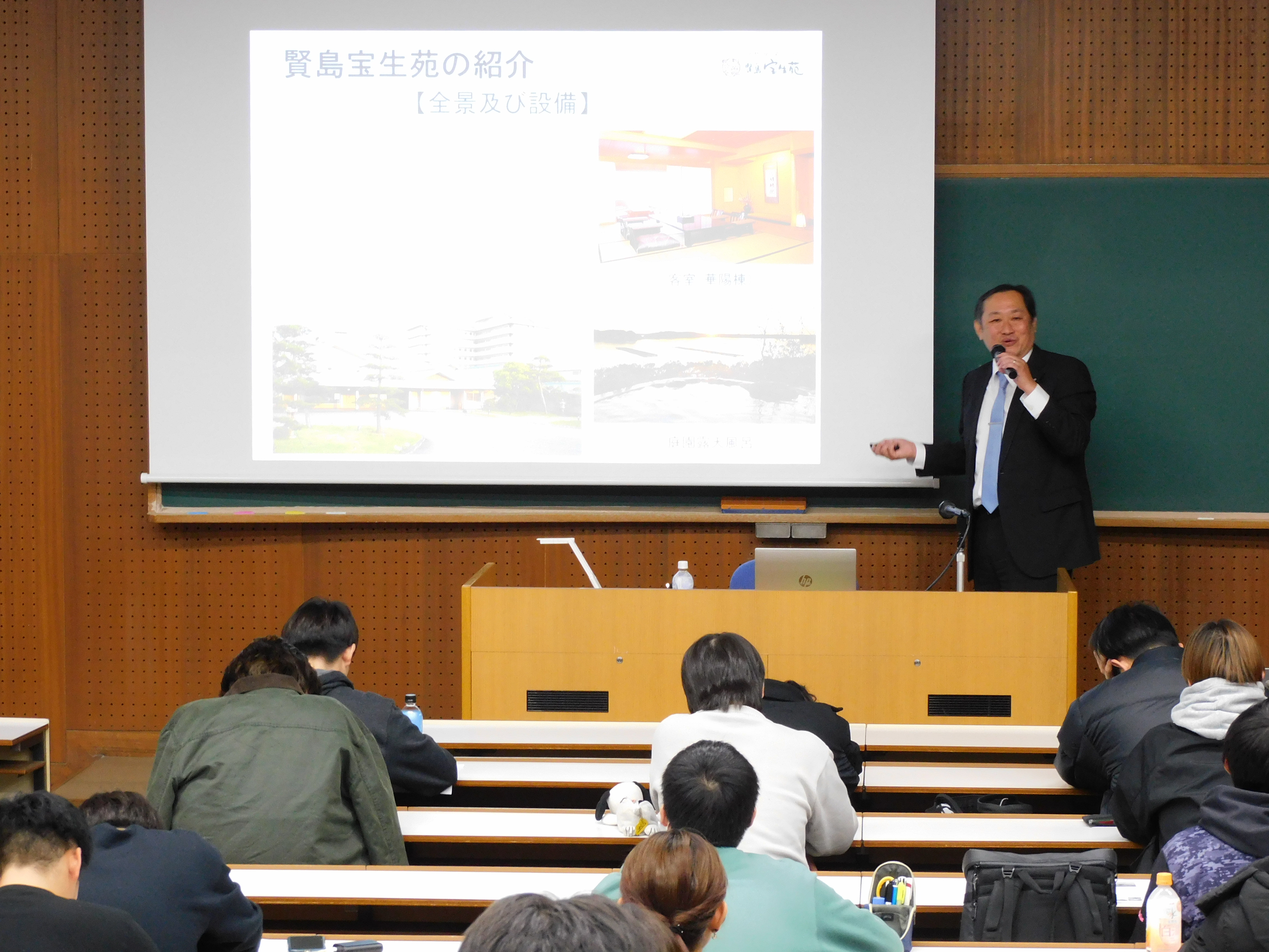 第10回目の講義では、(株)賢島宝生苑取締役総支配人の吉田忠弘氏をお招きし、「我が国旅館事業の現状」をテーマに講義をしていただきました。講義では、旅館業概要をはじめ、旅行業会の現状、旅館業界が抱える課題、問題点、事故・災害に対する備え、さらには能力開発の重要性についてご説明いただきました。