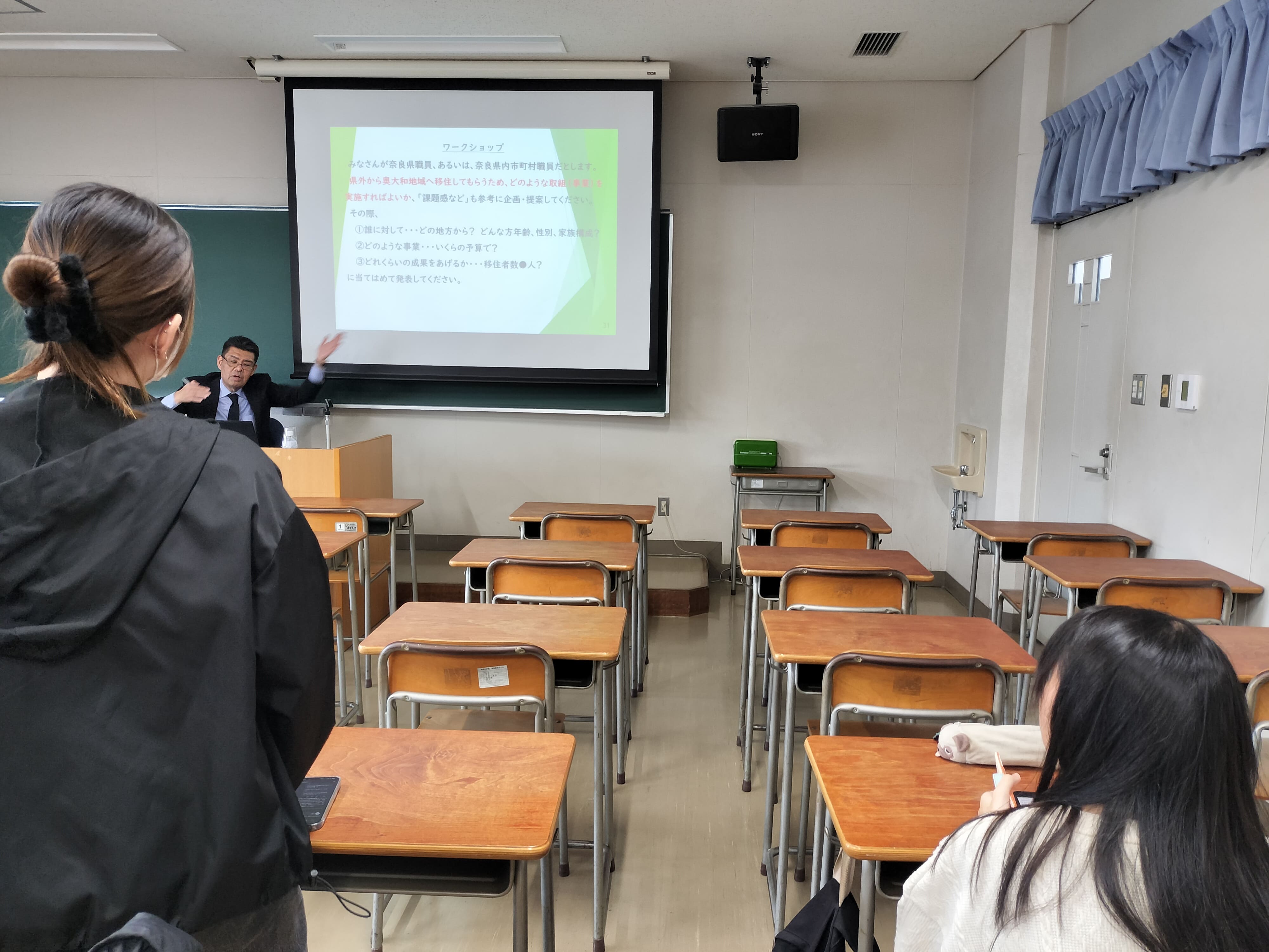 公務員プログラムの経済経営学部2年生が受講するキャリア演習A(公務員)では、11月14日、奈良県奥大和地域活力推進課課長の津田敏充様に講義いただきました。