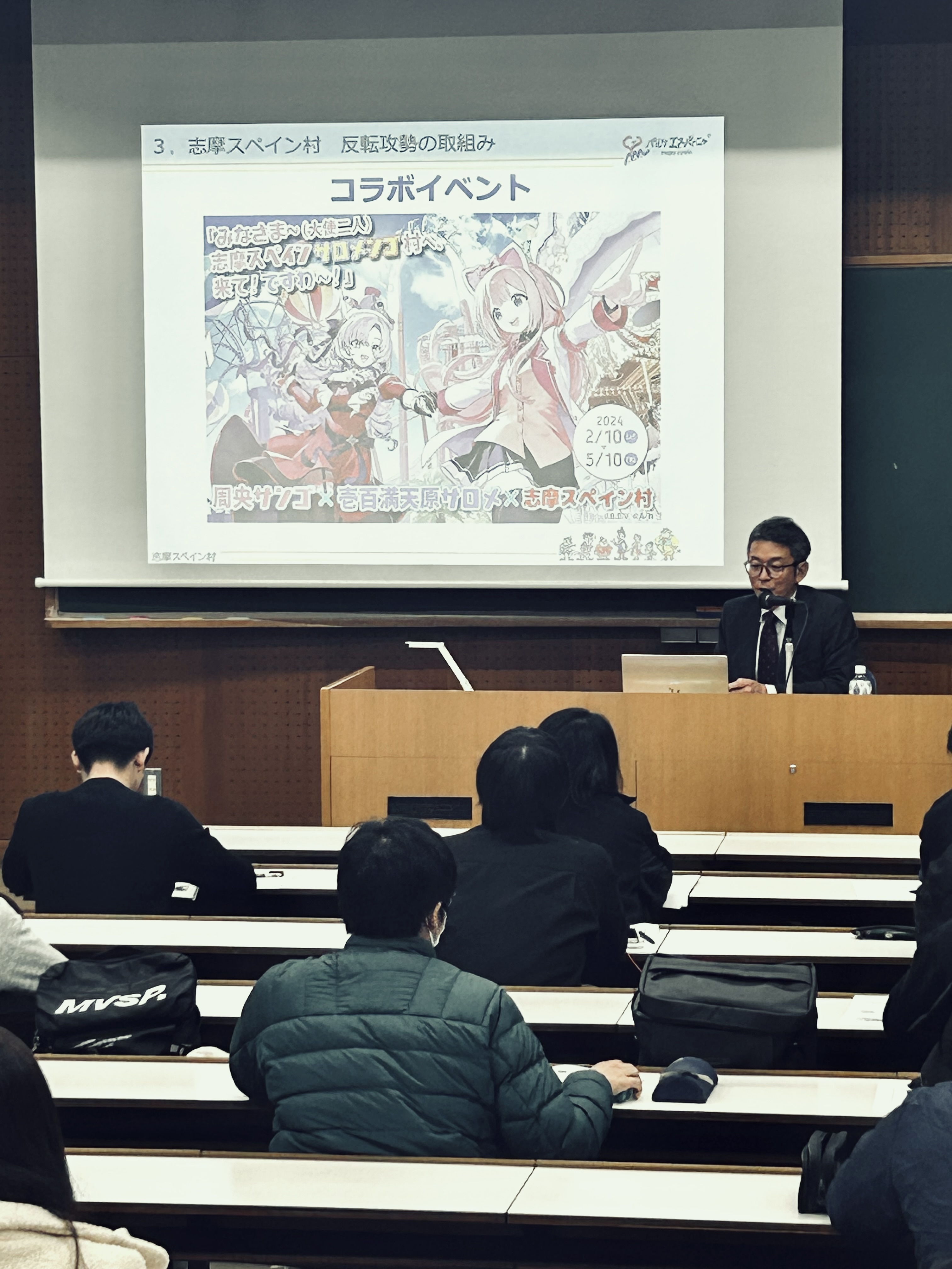 講義のなかでは、インフルエンサーがライブ配信を通じて「志摩スペイン村の魅力」を発信したことをきっかけに、瞬く間に反響が広がり、同施設への注目が急速に高まった事例が紹介されました。この現象を踏まえ、企業が偶然的に生じた出来事をどのようにビジネスの機会として捉え、戦略的に活用していくのかについて、とても有益なお話しを伺うことができました。