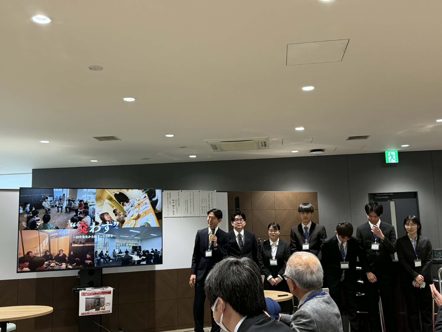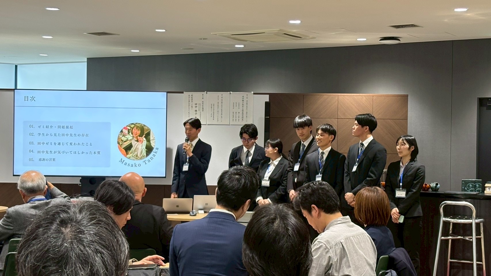 特にゼミ生による「教育活動に想うこと/交わす-田中先生から始まった2年半」では、学生からみた先生の教育が、いかに学生に影響を与え、どのような変化をもたらしたのか、また、人物像や田中先生への想いが語られました。