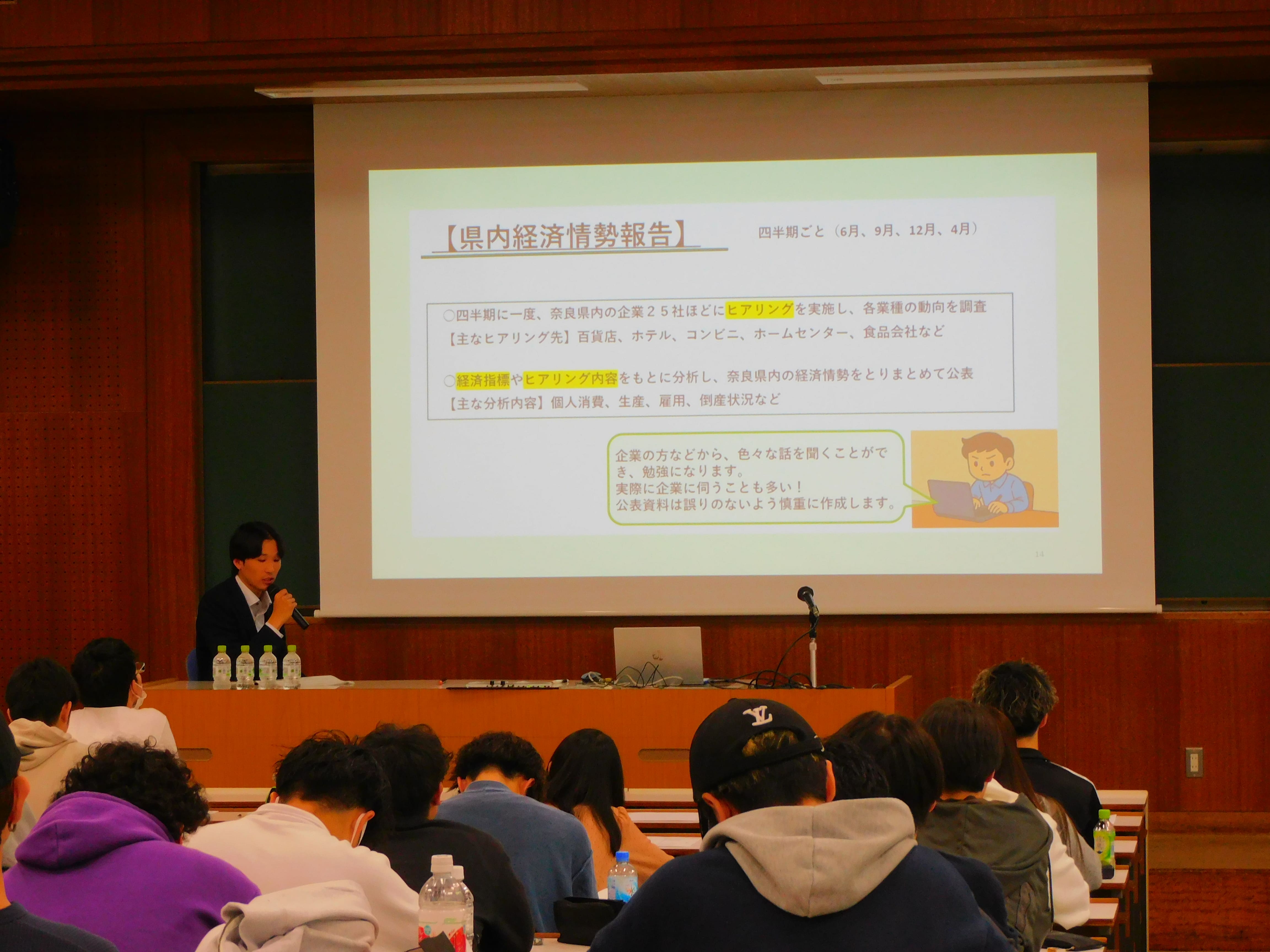 奈良財務事務所管財課・山本壱斗氏と財務課・竹谷壱之介氏からは、各課の日々の業務について説明があったほか、これから就職活動を迎える学生たちにご自身の経験に基づいた親身なアドバイスをいただきました。