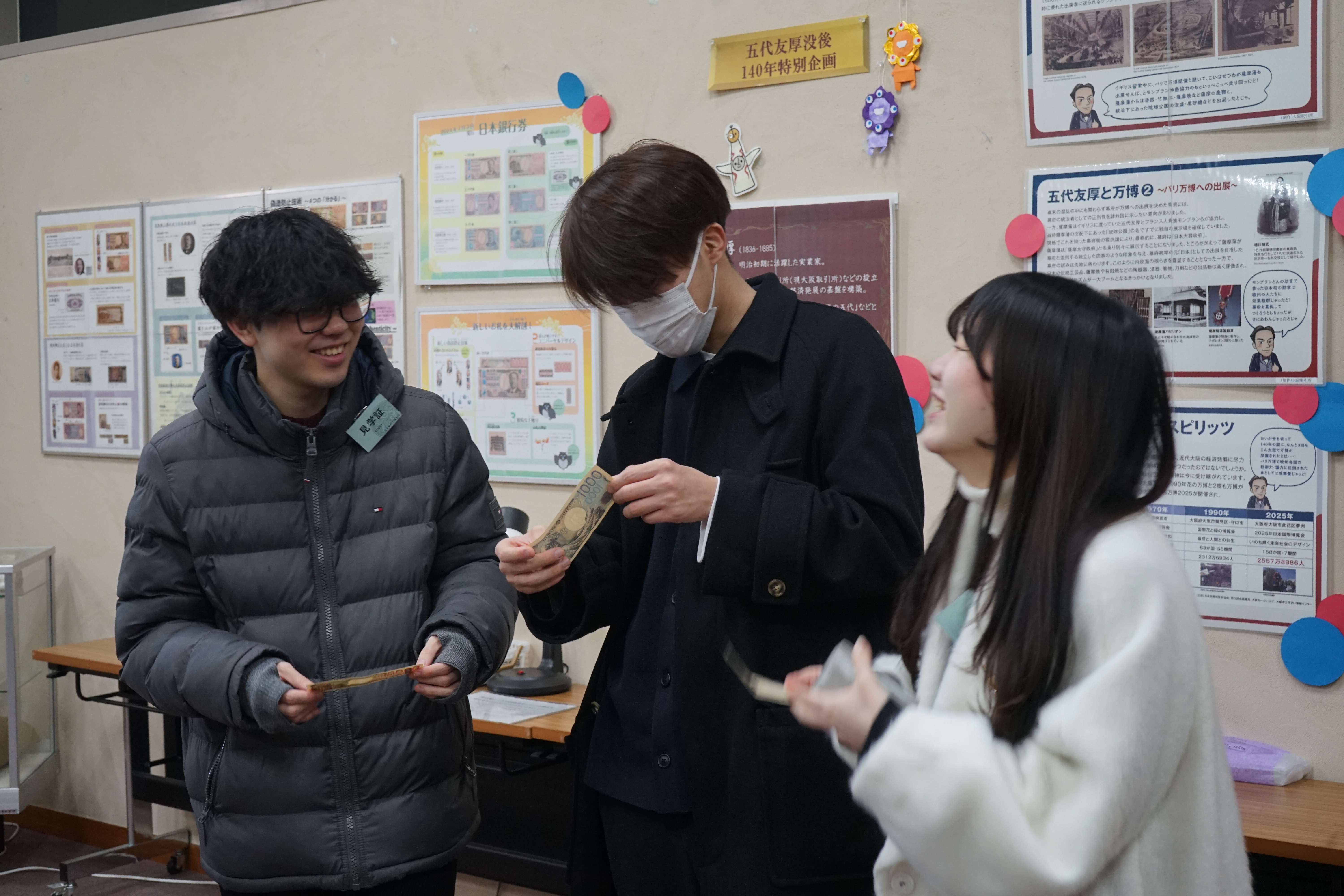 さらに、最新の日本銀行券に搭載された「3Dホログラム(傾けると三次元の肖像が回転する仕組み)」をはじめとする偽造防止技術についても学びました。世界初となる高度な技術が、日本の通貨に対する「信頼」を支えていることを、学生たちは改めて認識したようです。
