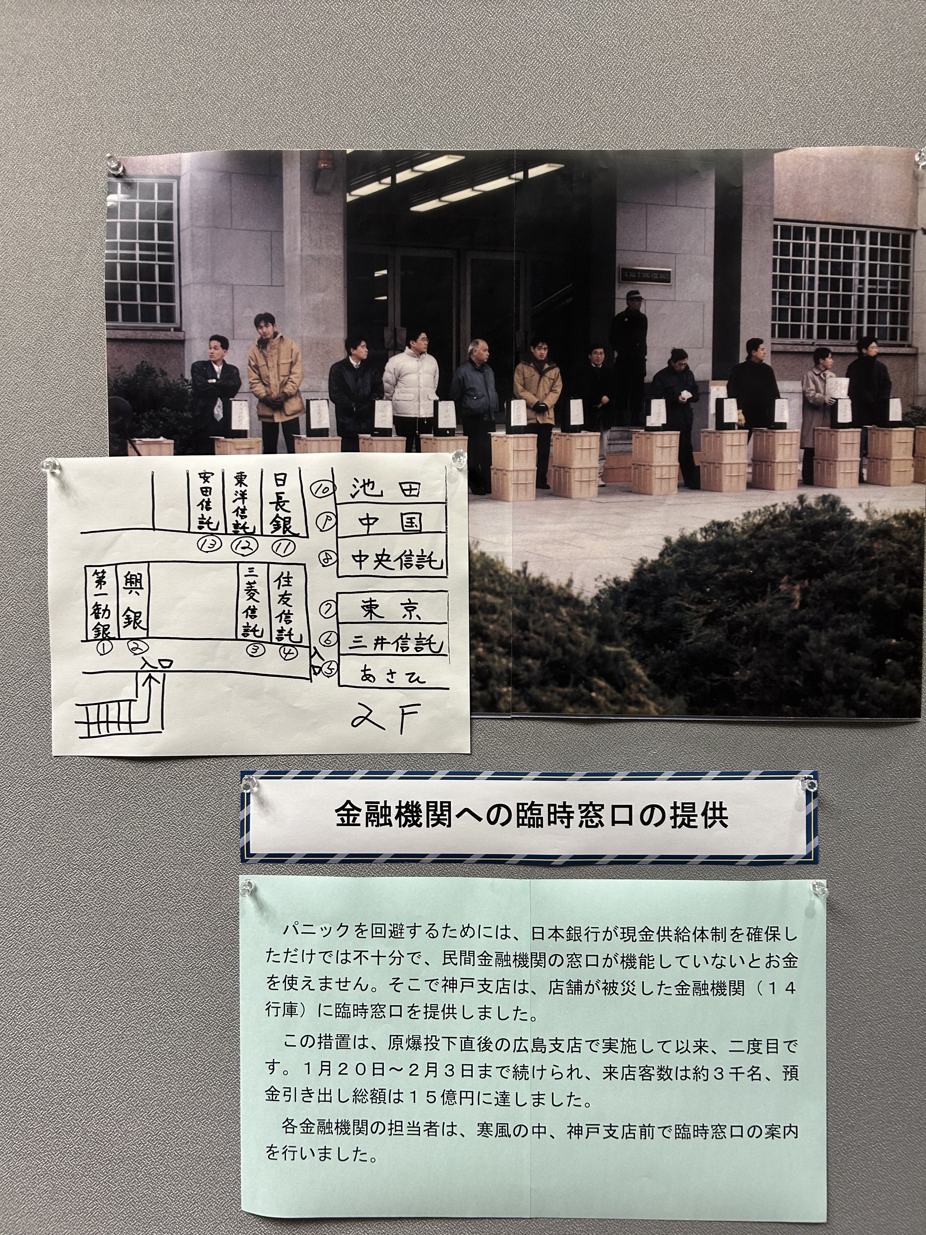 最後に、阪神・淡路大震災当時の神戸支店の対応に関する展示を見学しました。当時の支店長と総裁の間で交わされた手書きの手紙(震災の影響でPCが利用不可なため)などによるやり取りや、被災地での現金供給体制の維持に向けて奔走されていた様子が、当時の資料を間近に見ることによって伝わってきました。「通貨というインフラ」の重要性を痛感するとともに、BCP(事業継続計画)の重要性を学ぶ貴重な機会となりました。