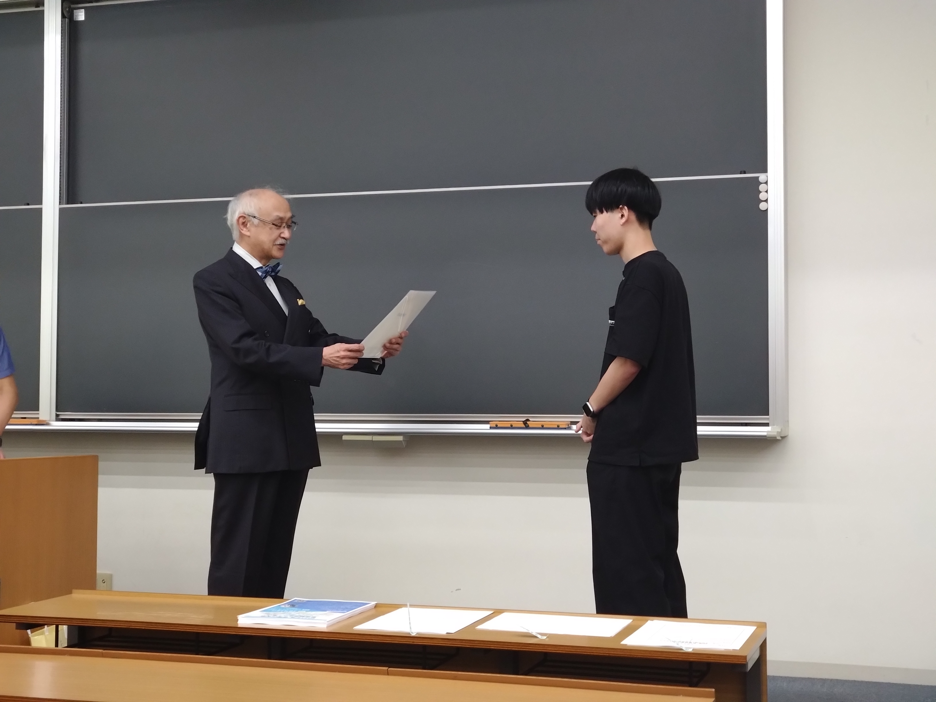 各学年のガイダンスに先だって、前期に優秀な成績を修めた学生へ表彰状と副賞が授与されました(写真は一部の学生です)。
