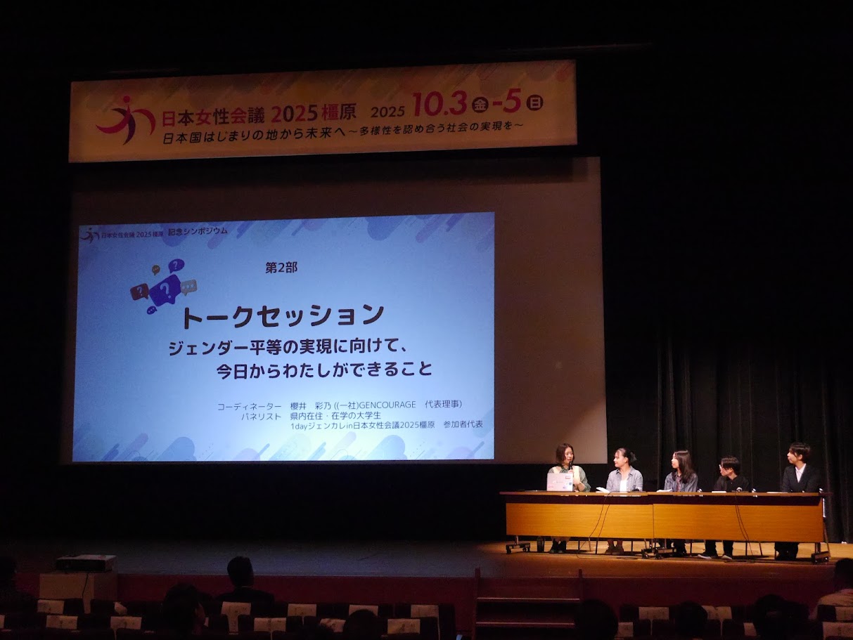 2025年10月4日(土)に橿原市で開催された「日本女性会議2025 in 橿原 」の記念シンポジウム「大学生と考える! ジェンダー平等って何ですか?~自分たちの未来を変えるために~ 」において、本学法学部の前期授業「専門基礎演習A」( 末吉ゼミ)から2名の学生(金城光さんと沼田彩希さん、 いずれも法学部法学科2年)が登壇しました