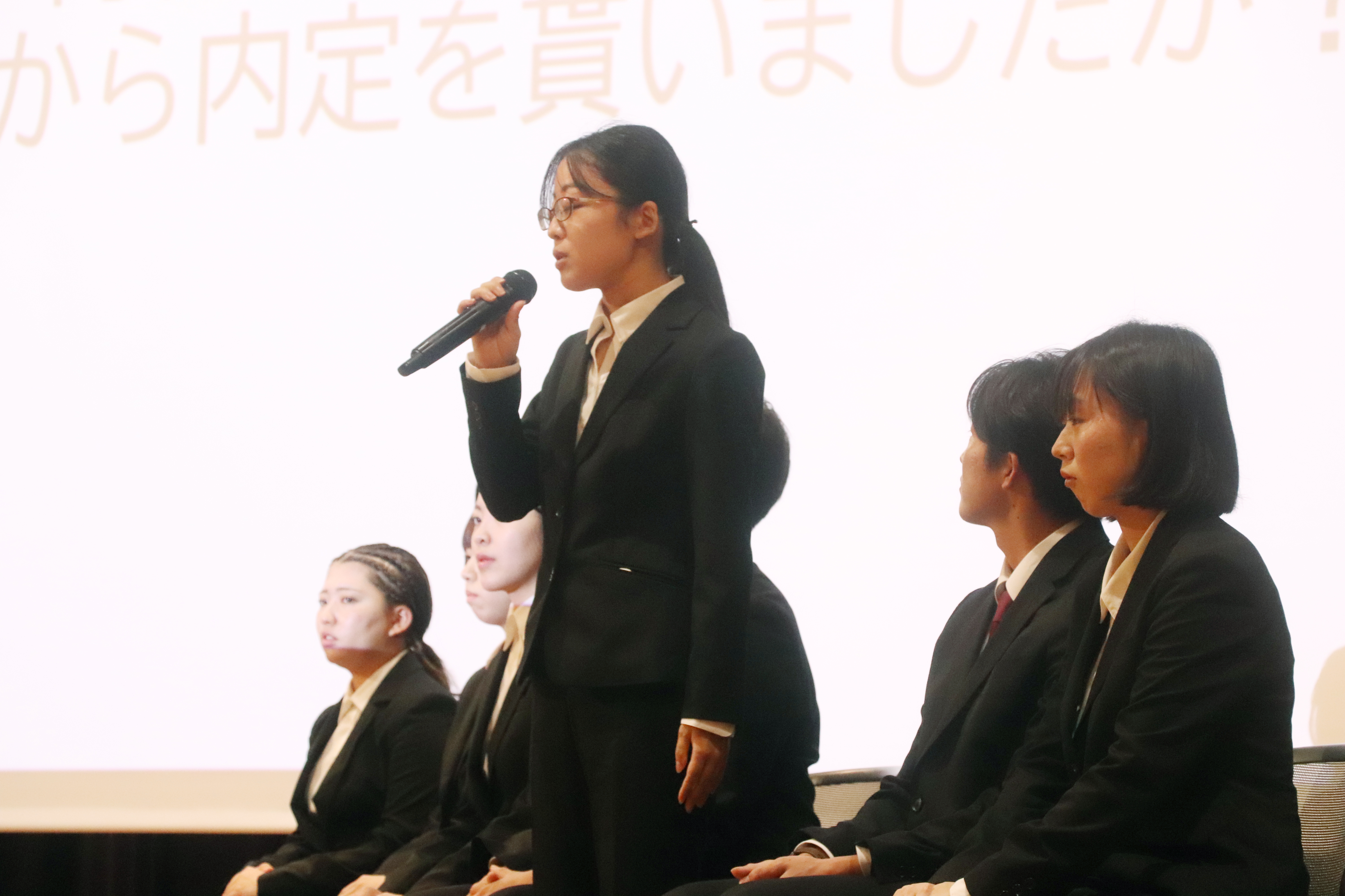 また、キャリアセンター職員から就職活動の現状について説明があった後、各学科の就職活動を終えた4年生が登壇し、就職活動を振り返ったコメントがありました。