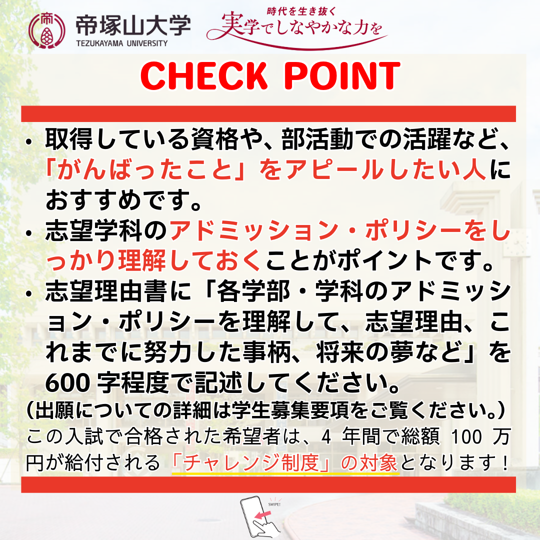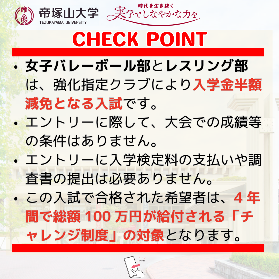 自由応募型の入試で合格された希望者は、4年間で総額100万円が給付される「チャレンジ制度」の対象となります!!
