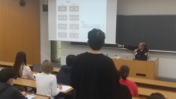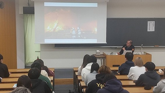 今回の法学部の特殊講義「キャリア研究」*では、いわゆる消防官(消防吏員)の職場である奈良市消防局から講師をお迎えしました。