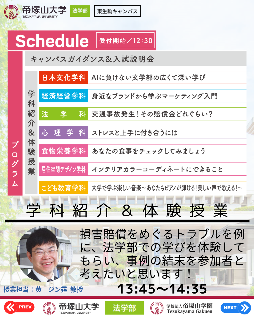 法学部では「交通事故発生! その賠償金どれぐらい?」というテーマの模擬講義を予定しています。