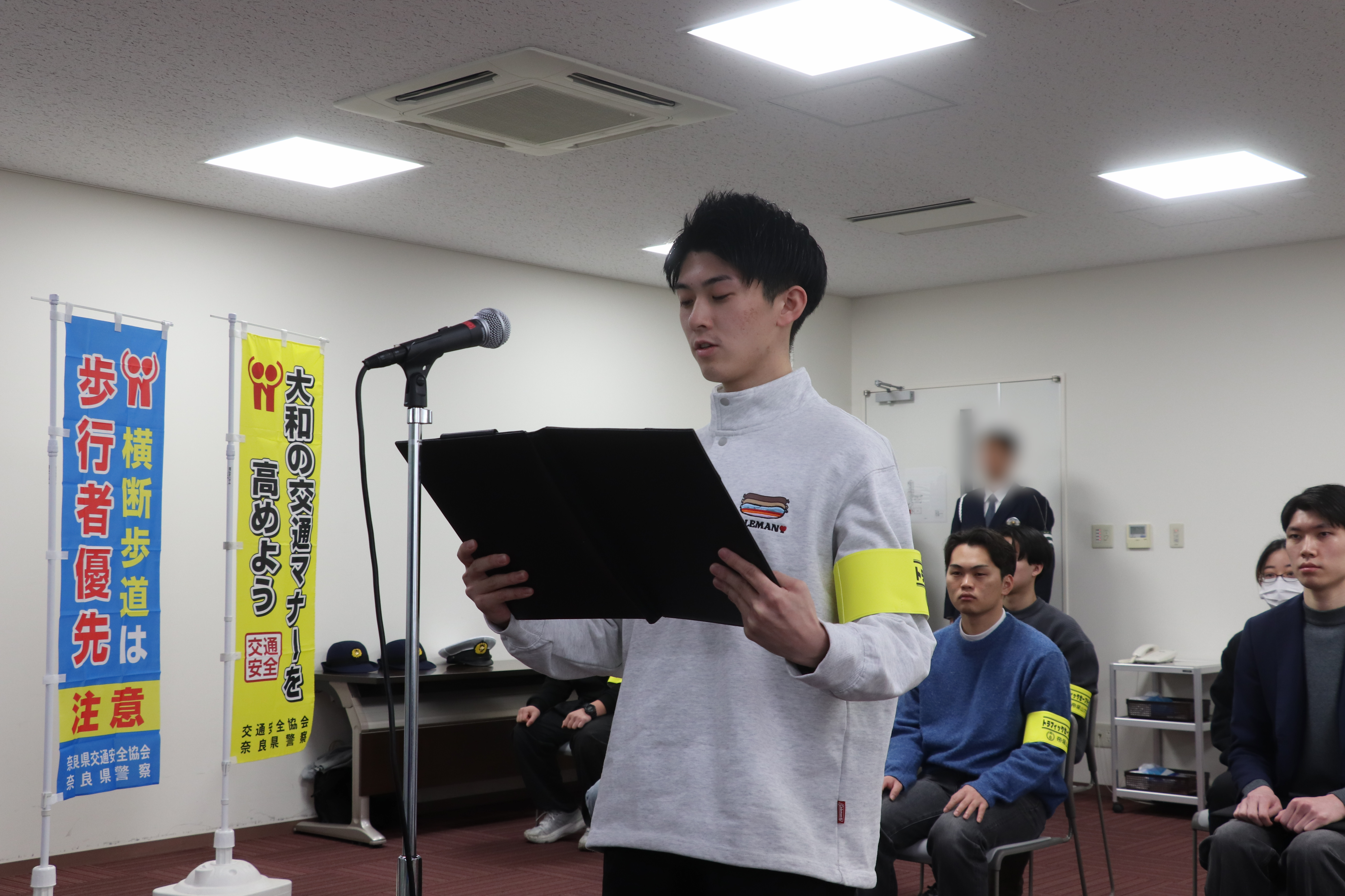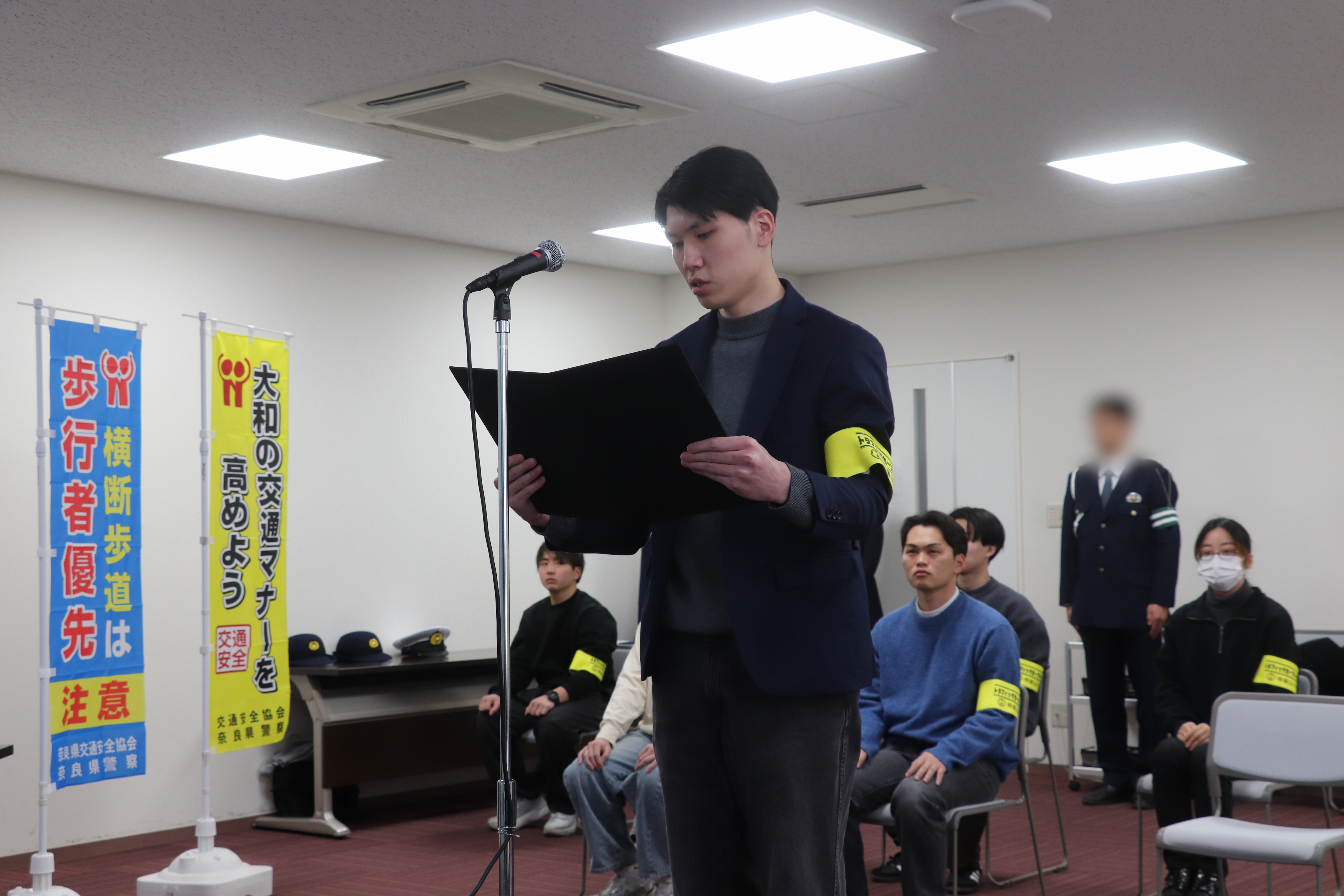 当日は、奈良西警察署長、法学部長からそれぞれ挨拶があり、引き続いて、代表学生から設立宣言と決意表明がありました。