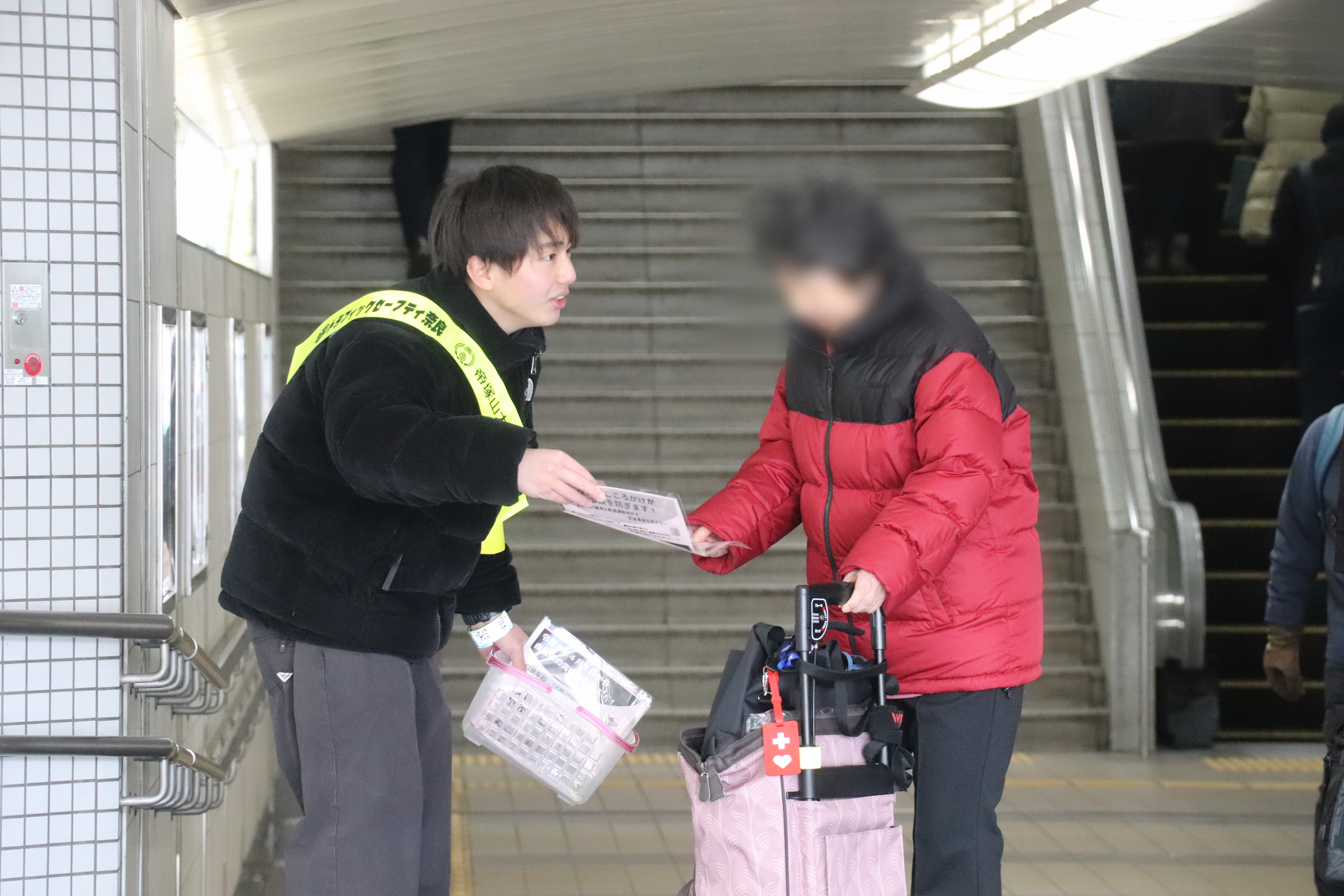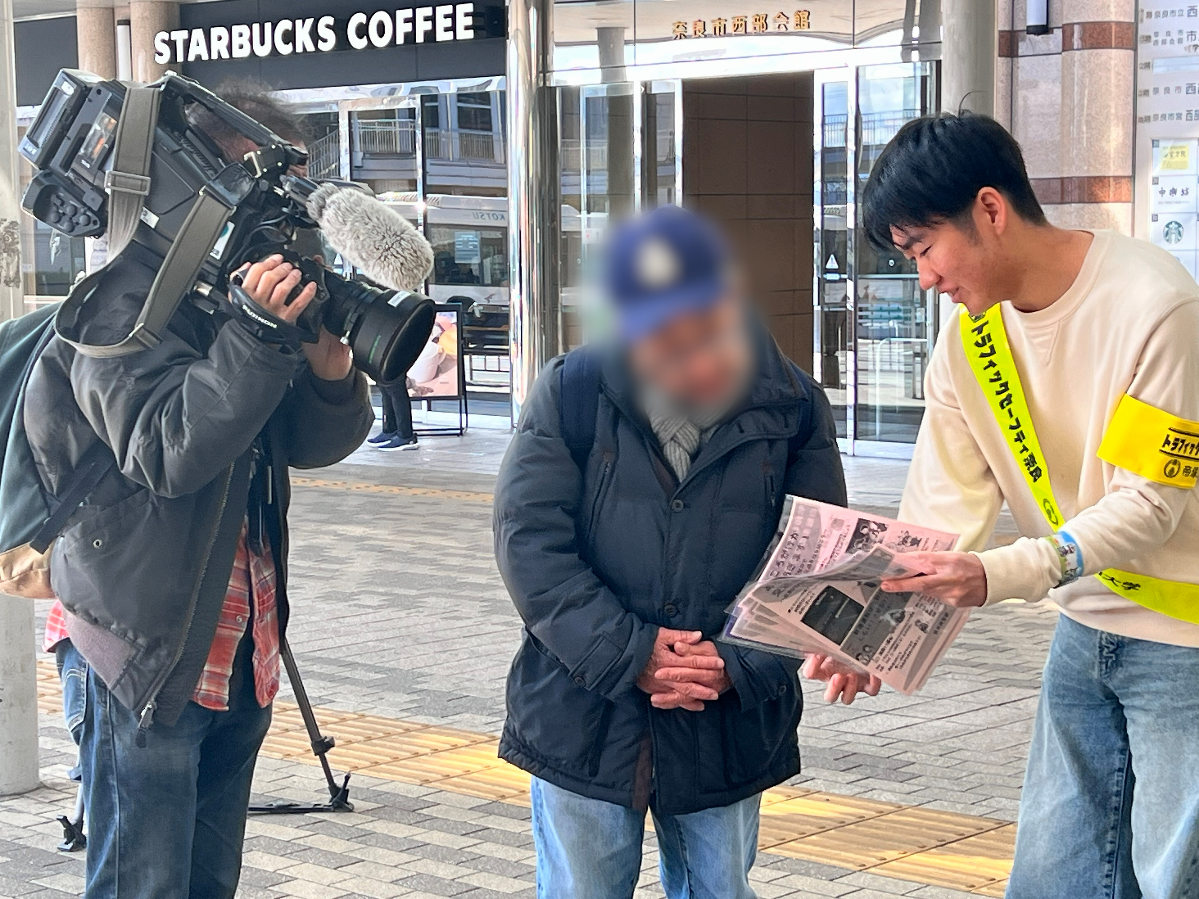 その後、近鉄学園前にて初の啓発活動を実施し、通行人に交通安全を呼び掛けるとともに、啓発グッズ・チラシや反射材を手渡しました。