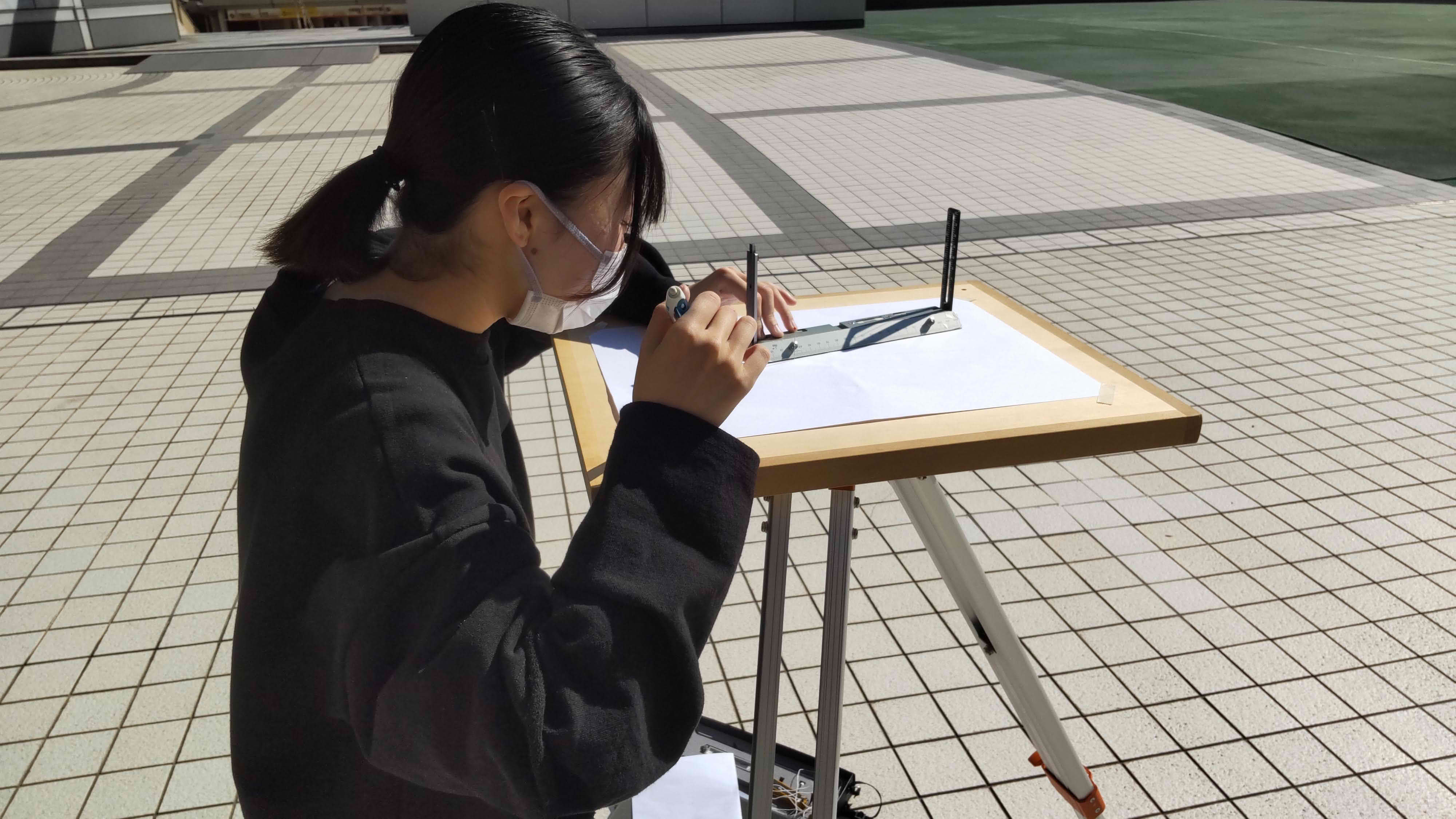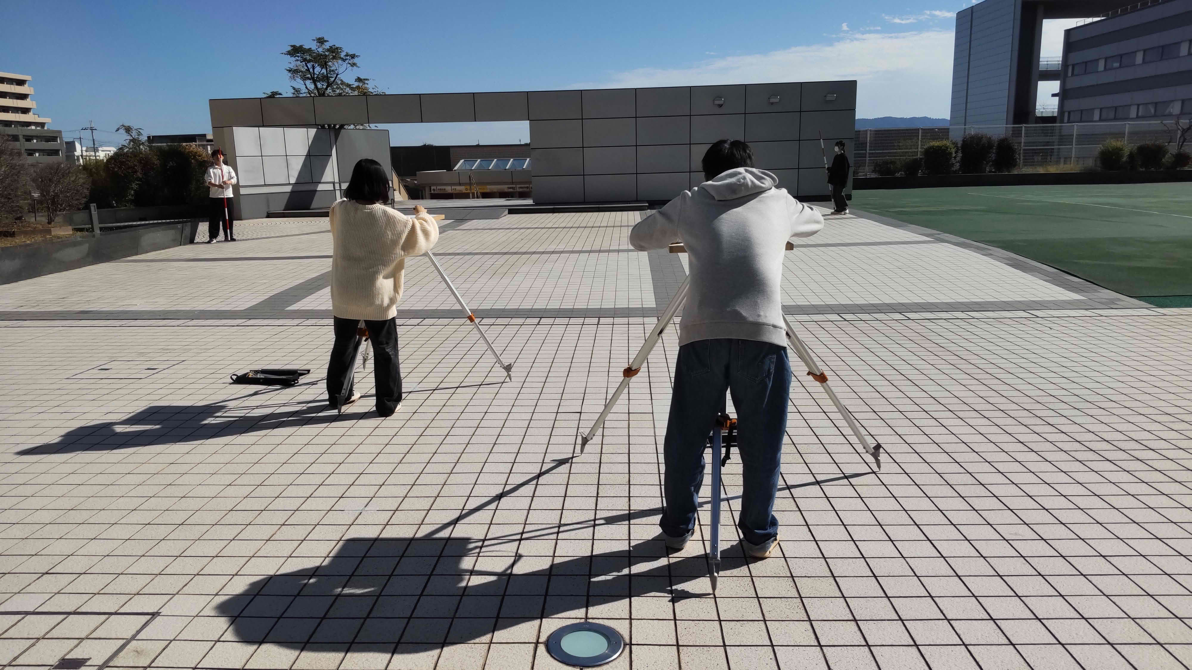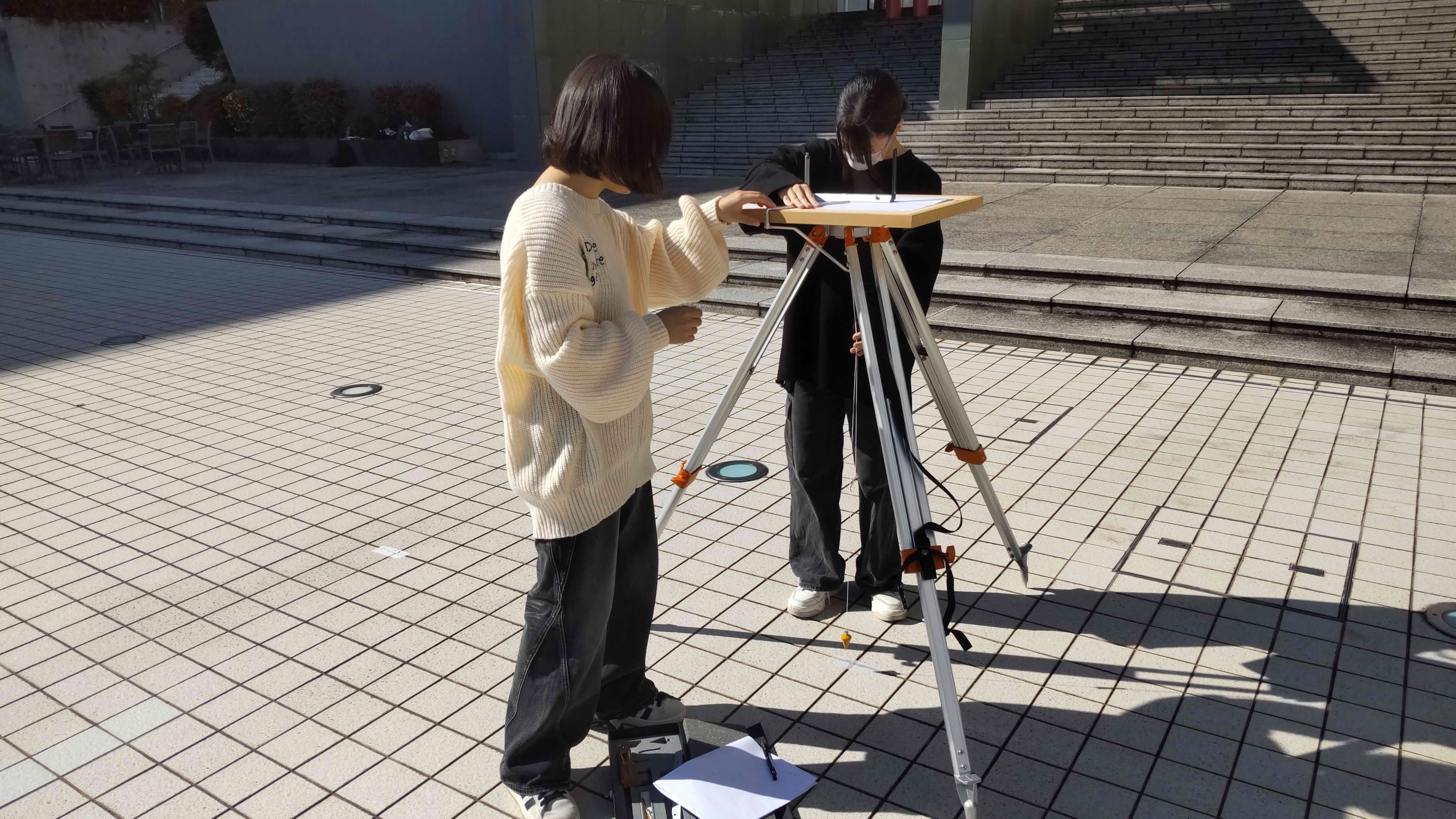 建築実験の授業で平板測量を行いました。平板測量は、測った結果を図紙に縮尺して書き込みながら地形図を描いていく方法で、現場で地形や地物の位置をすぐに把握できるのが特徴です。参加者全員はじめての測量でしたが、実際に機器を使って作業することで、測量の基本的な原理を体感しながら学ぶことができ、理解もぐっと深まりました。