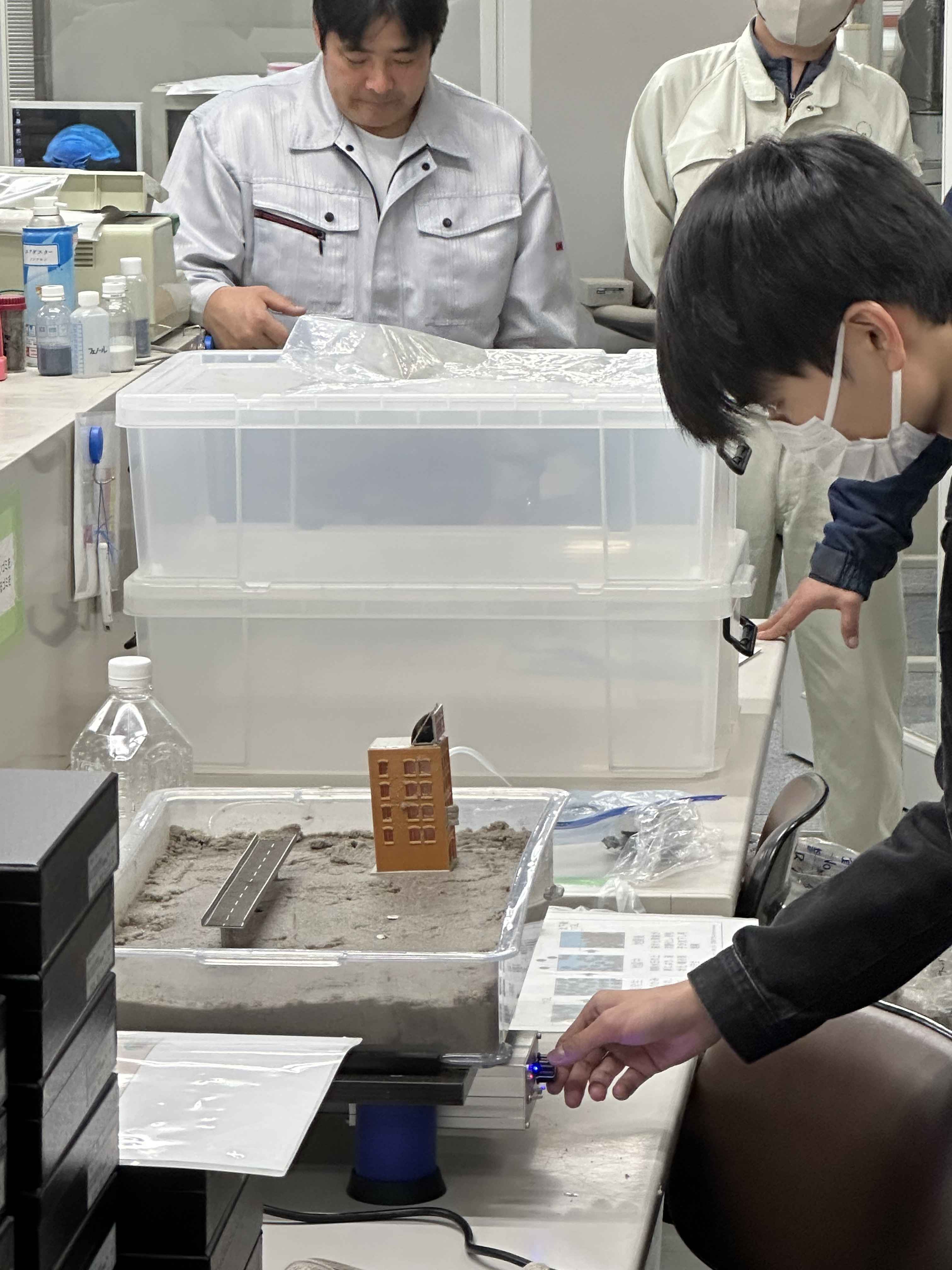 さらに、液状化現象の模擬振動実験を見学し、支持層まで届く杭基礎の有効性を実感しました。