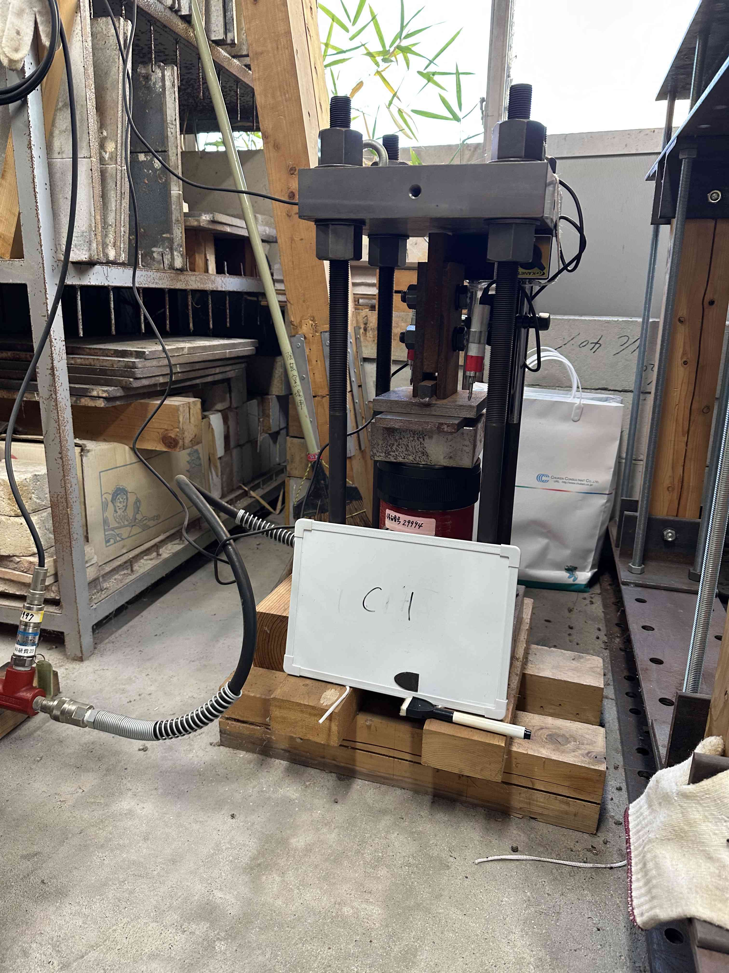 自分たちで組み立てた試験体に油圧ジャッキで力を加え、荷重と変位のデータを収録しました。