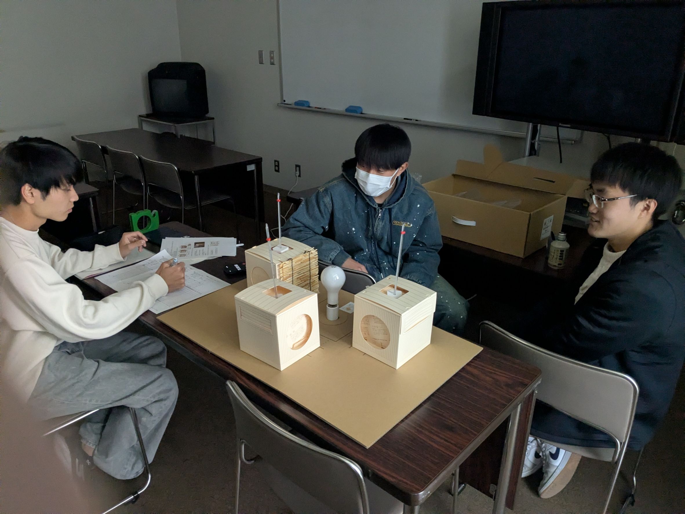 3つの箱型模型では、断熱材や蓄熱材を入れたり、すだれやカーテンをかけたりして、内部の温度環境を調整できます。中央の電球からの熱のON・OFFで外気温の変化を再現し、3つの模型内の気温を比べることで、冬に暖かく過ごせる家の断熱仕様を見つけ出します。