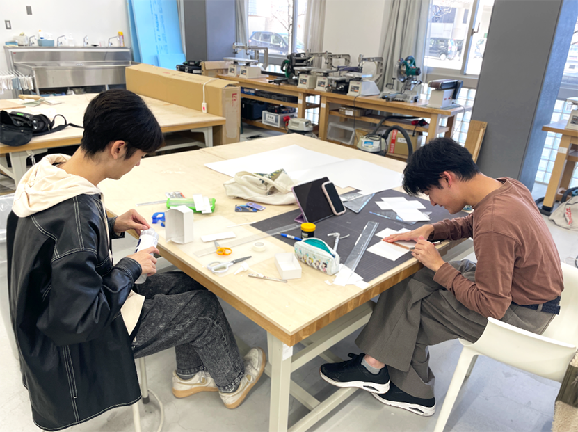 学生たちはこれまでに考案したパッケージ案をスケッチでプレゼンしており、今回はそれを実際の立体パッケージとして形にする作業を行いました。