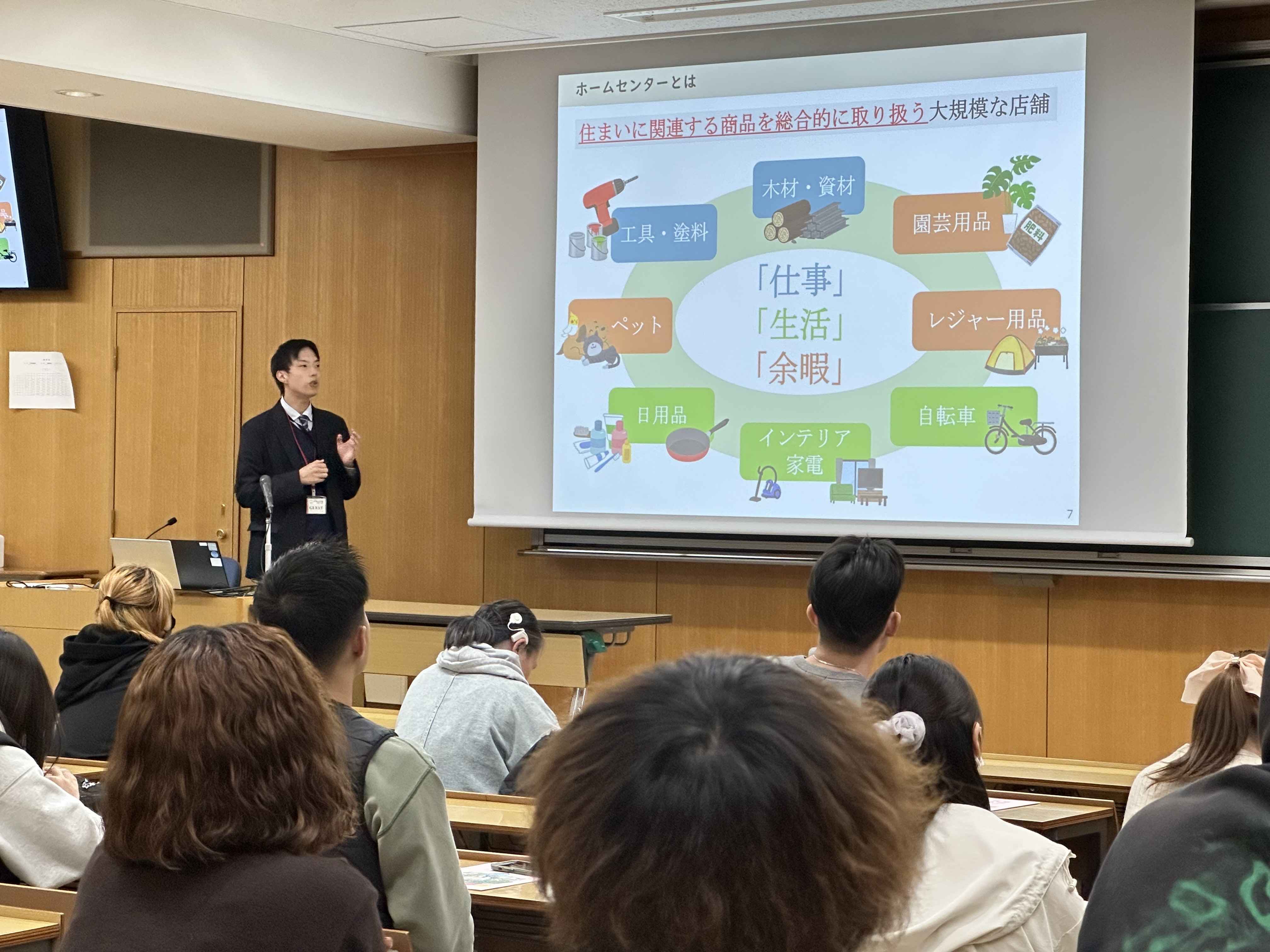 小売業界の「ロイヤルホームセンター」様からは、小売業の全体像と、建設資材に強みを持つ業務内容を紹介。学科の学びとのつながりを実感し、学ぶ意義を再認識する機会となりました。