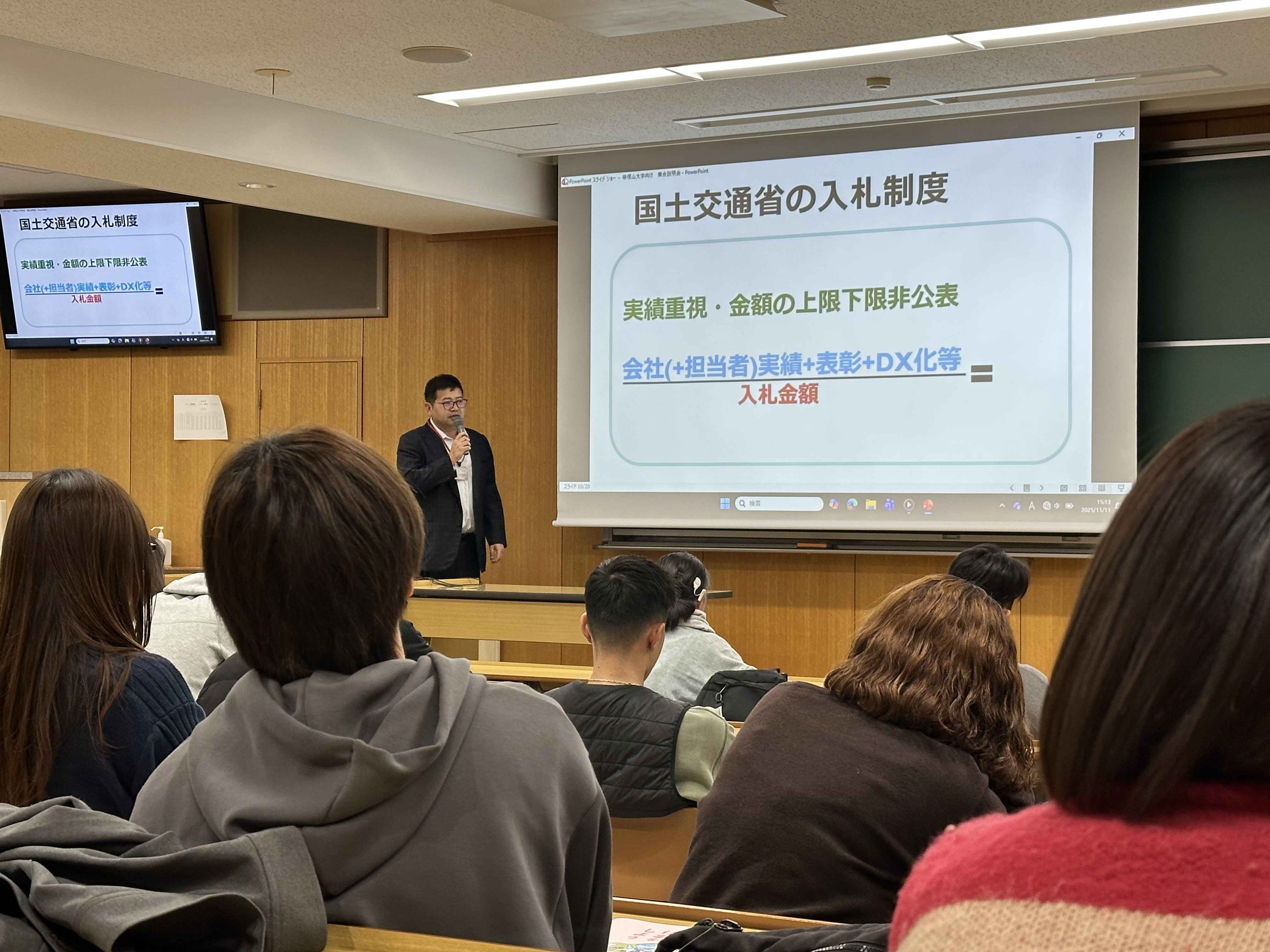 奈良・富雄の建設会社「山上組」様をからは、地元奈良市の建設業の仕組みや入札制度について詳しく解説。普段知ることのない制度の話に、学生たちは目を輝かせました。