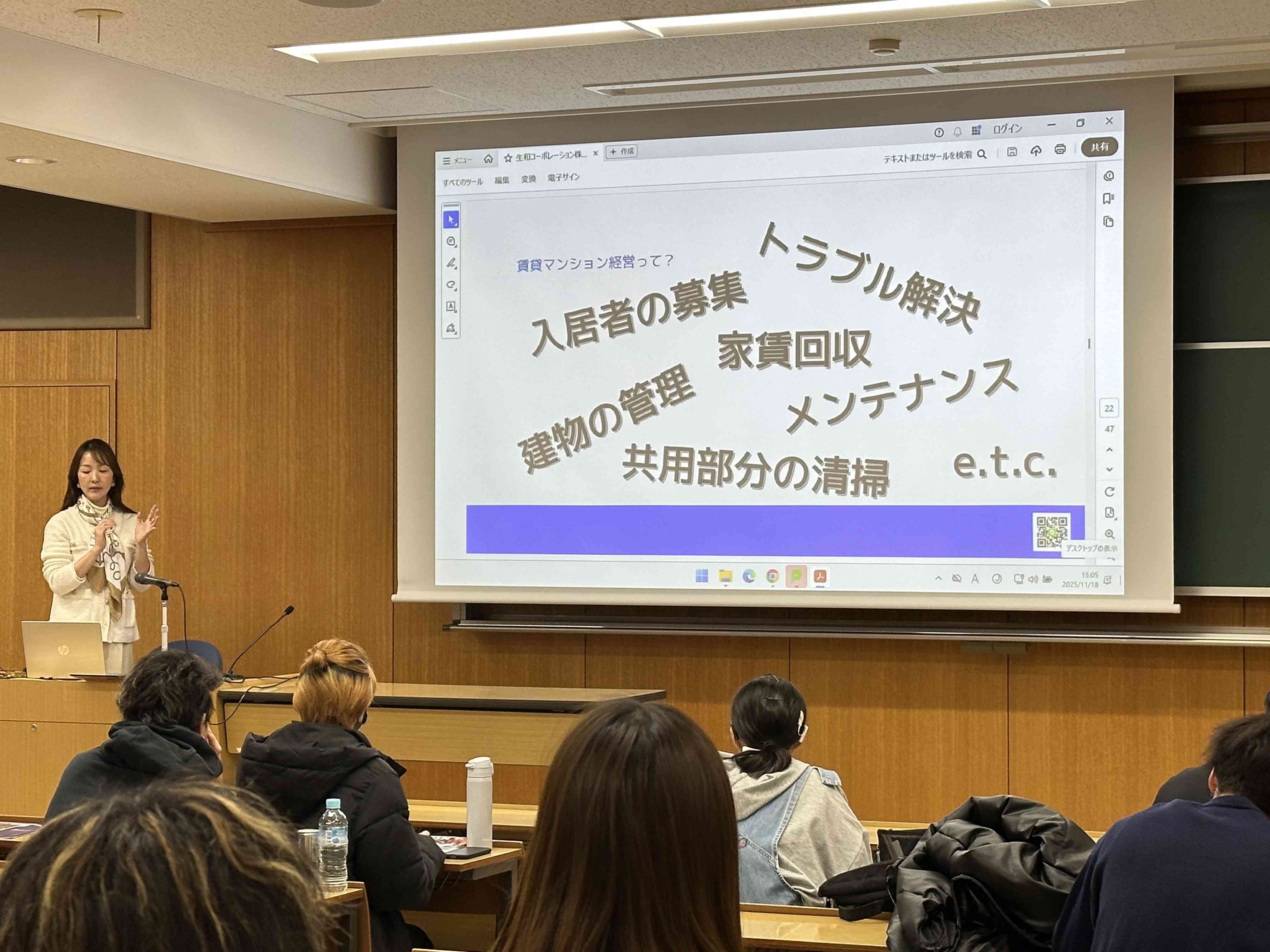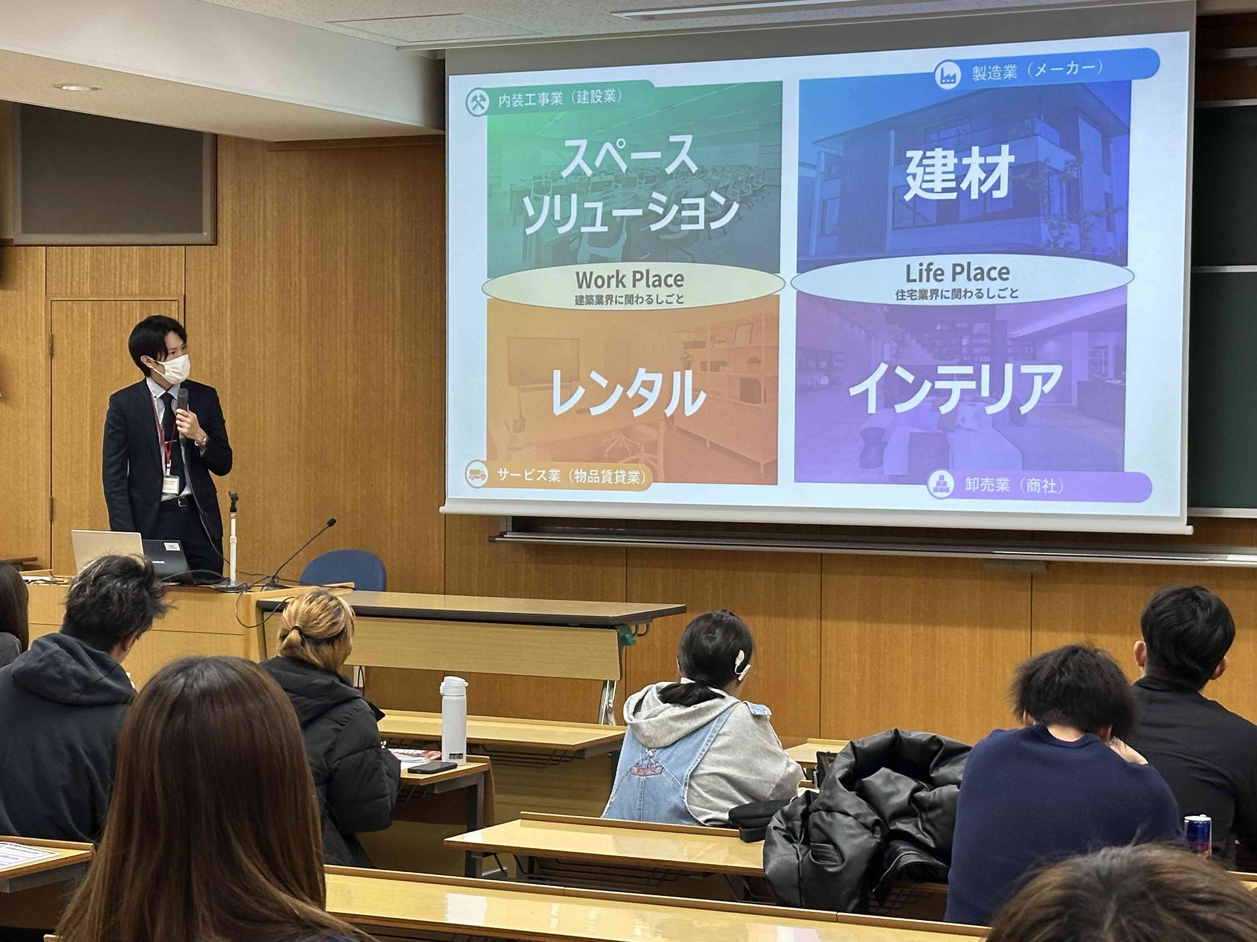 土地活用コンサルやデザイナーズマンションの企画、インテリア・建材・レンタルなど多彩な事業を通じて、学科での学びが社会でどう活きるかを実感できる時間となりました。