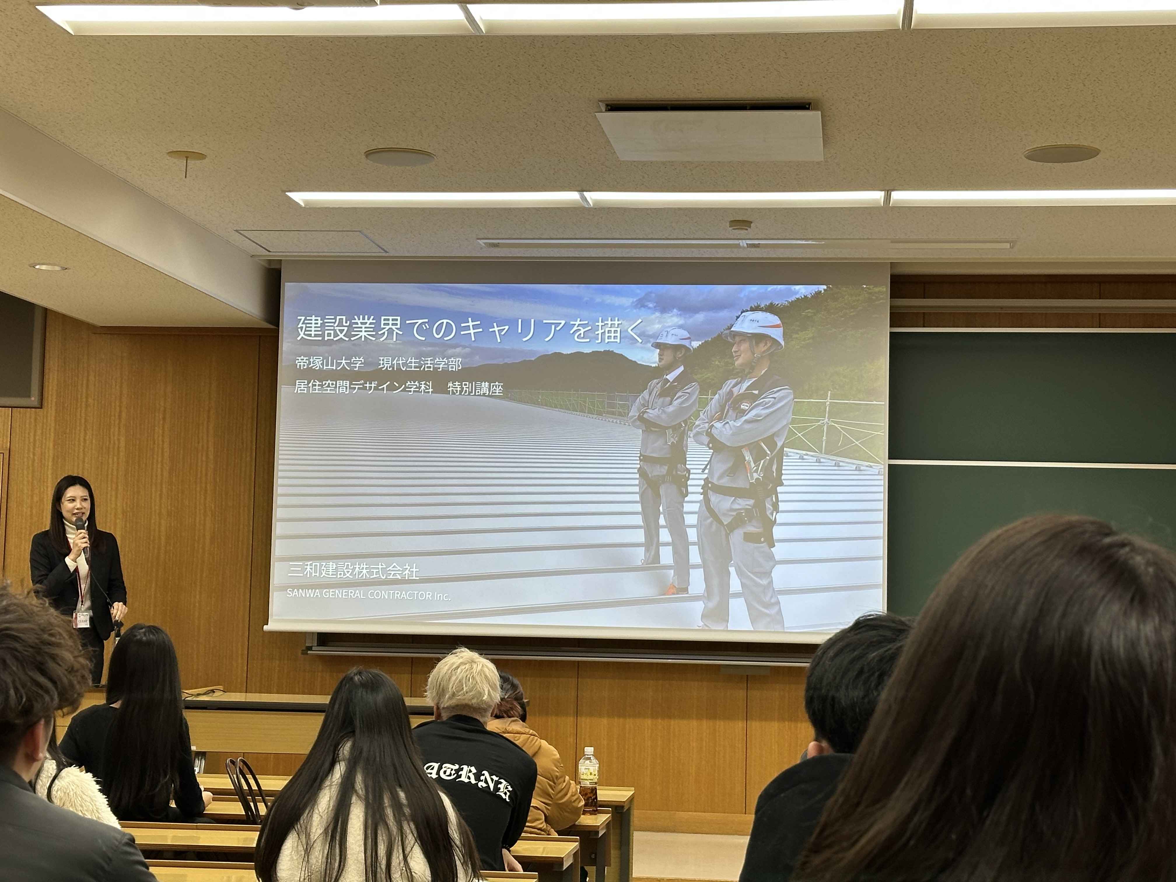 三和建設様からは、食品工場づくりの最前線と、企業理念「つくるひとをつくる」に込められた思いを紹介していただきました。また、本学の早期内定者である3年生が登壇し、就職活動の実際や会社選びのポイントを語ってくれました。
