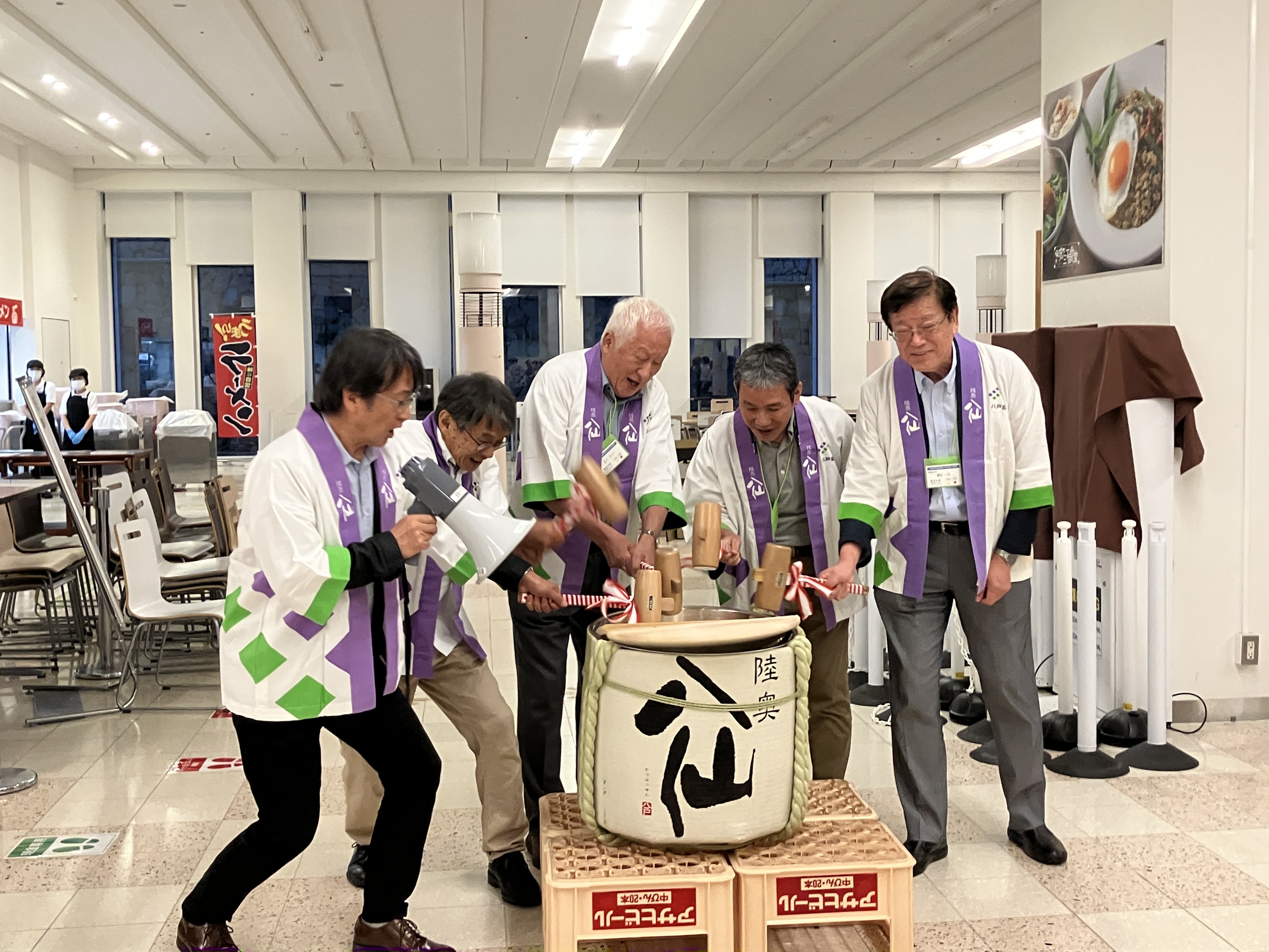 なお、本学会の第90回大会は、昨年度に本学で開催予定でしたが、残念ながら台風の接近で直前でオンライン開催に変更になりました。今年度大会の初日に開催された懇親会では、大会委員長からの昨年度大会の労いとご厚意で、谷口教授と本学名誉教授の蓮花一己先生、森下高治先生が乾杯前の鏡開きに参加し、会を大いに盛り上げていました。