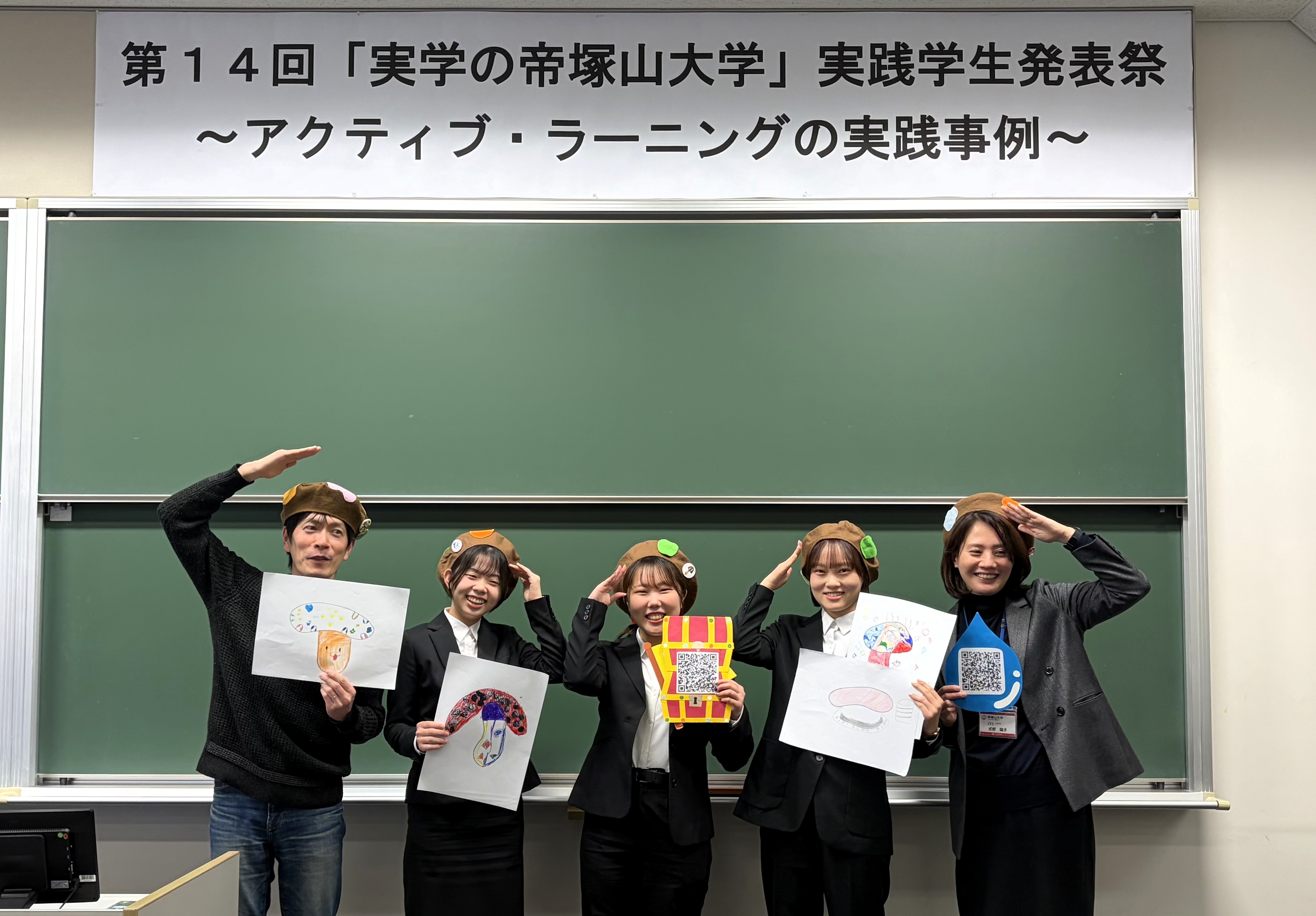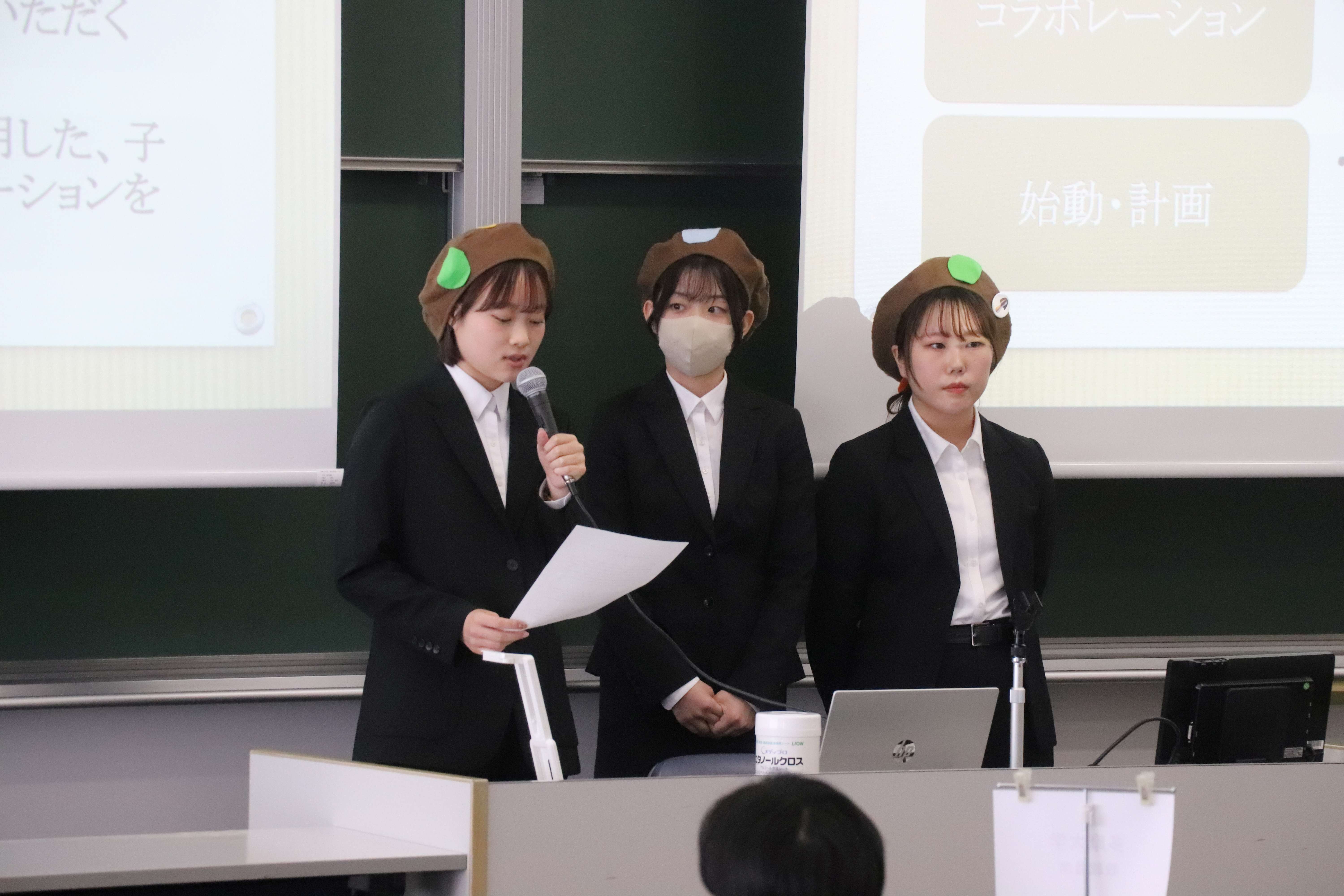 当日は研究協力者のキノコさん(マッシュ&ルーム)にも発表を聴いていただけることになり、学生もキノコになって、研究の成果をプレゼンテーションしました。